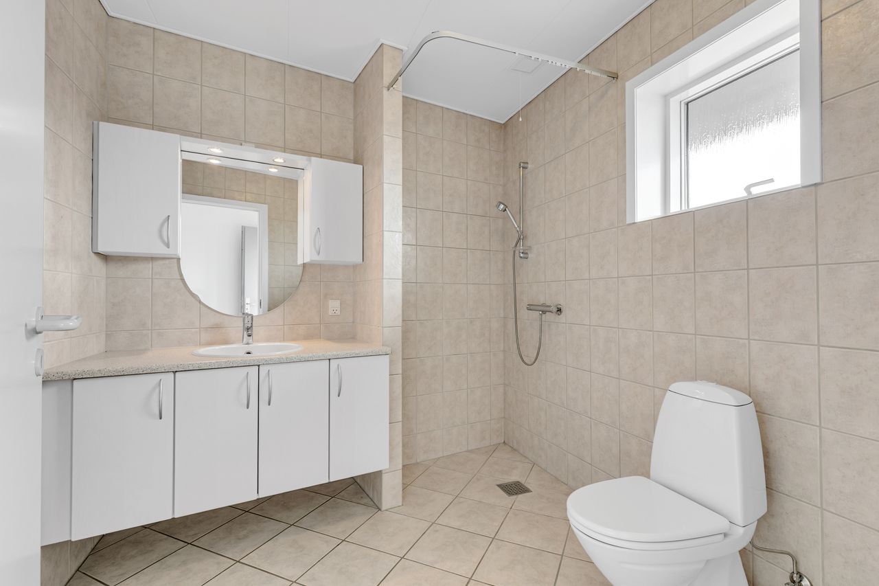 Pænt stort lyst badeværelse med stor sep. bruseniche, diagonalt liggende klinkegulv med gulvvarme, nydeligt badeværelses miljøskab, med nedfældet håndvask.