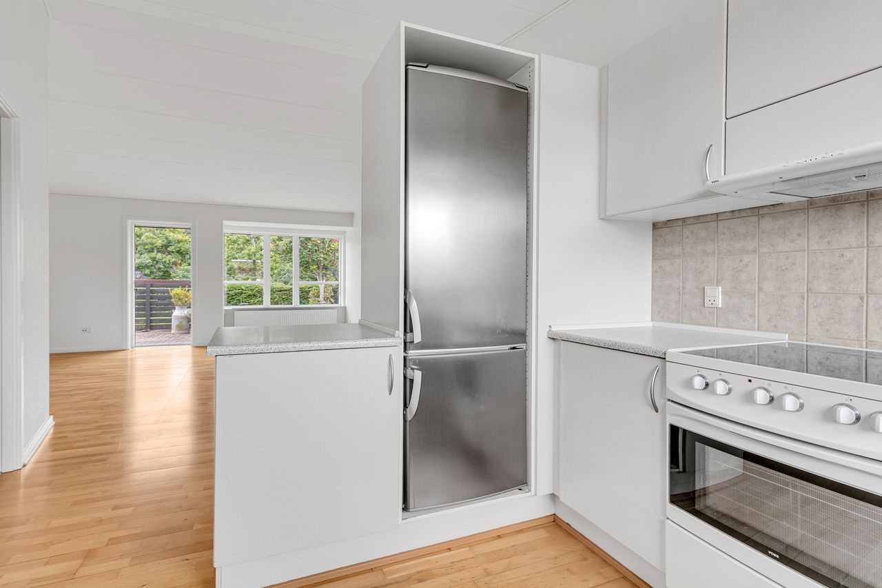 Fra stuen er der åben forbindelse til det pæne køkken med lyse elementer.