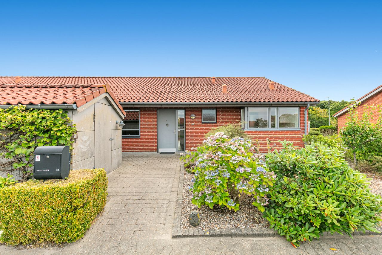 I det skønne Hjerting udbydes nu denne velindrettede 1 plans Andelsbolig, på 95 m2, med tilhørende udhus.