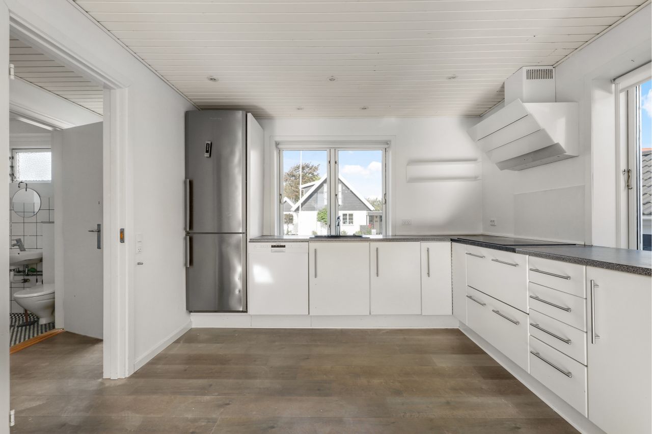 Pænt stort lyst køkken med hvide køkken elementer og i åben forbindelse til alrum / stue. I køkkenet er der pålagt pænt mørkt laminatgulv samt spots i loftet og i alrum/stue er der god plads til spisebord samt opholdsstue,er der pålagt massivt flot parketgulv, da rummet er særdeles møblerings venlig og der er dør ud til have samt stor flise terrasse og det foregår ned at flot galvaniseret trappe.