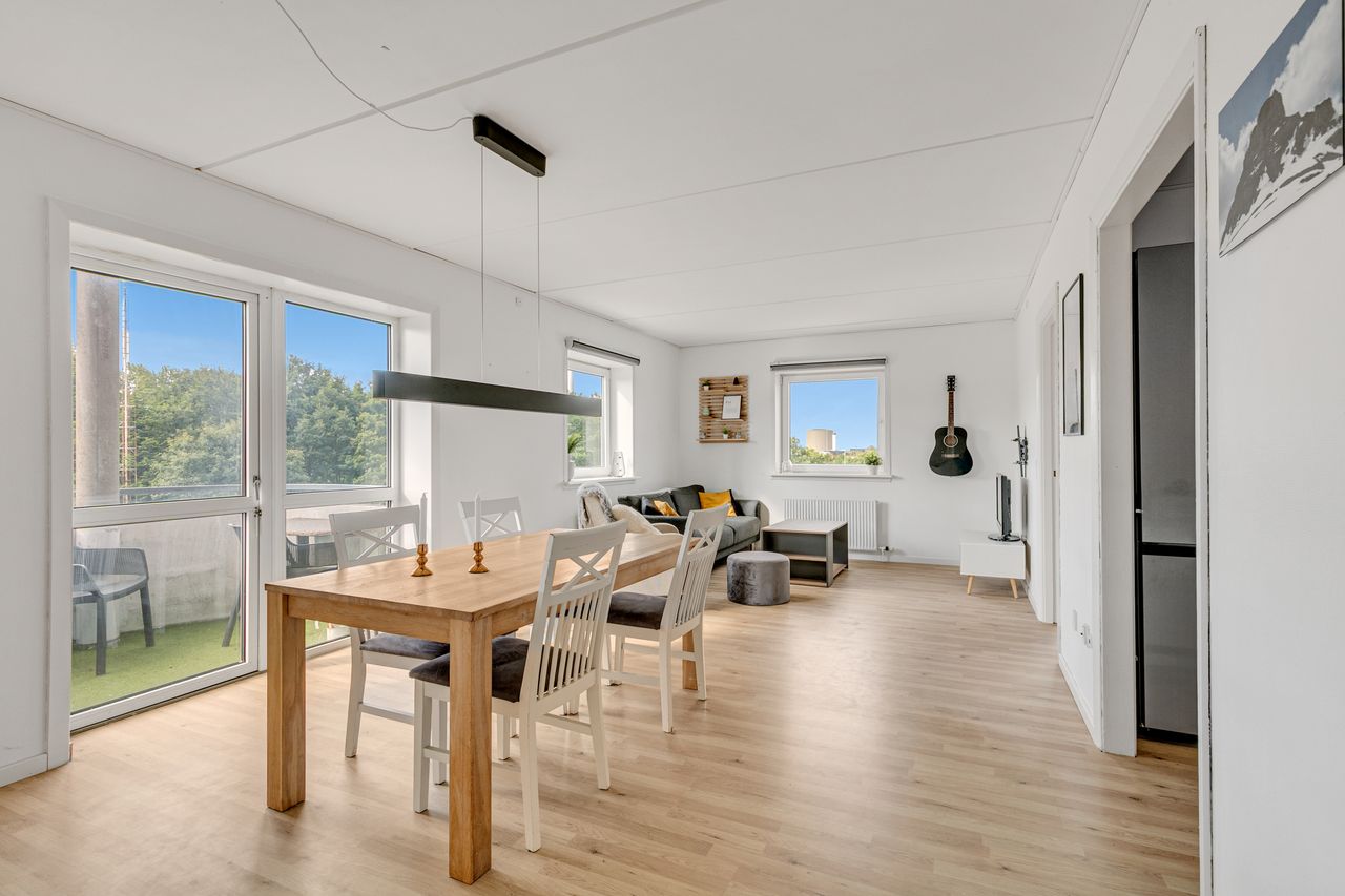 Særdeles stor lys møblerings venlig opholdsstue, hvor der er god plads til indretning,af hyggelig opholdsstue samt god plads til spisebord og i åben forbindelse til køkkenet, endvidere er der udgang til solrig altan, med god udsigt.