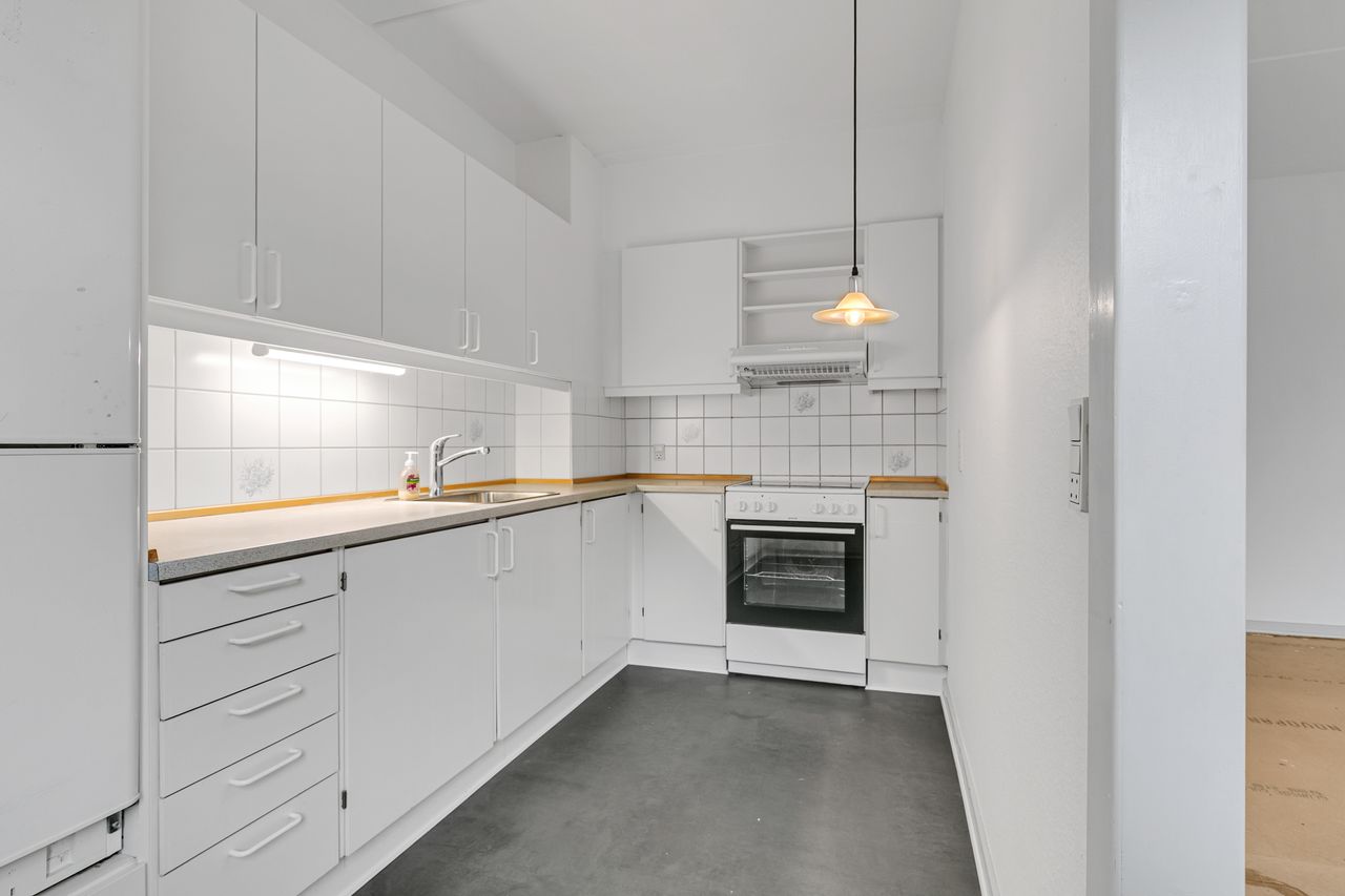 Skøn stor lys opholdsstue som er møblerings venlig og med udgang til den skønne atrium have, fra stuen er der direkte adgang til køkken med plads til spisebord ,elementkøkken med hvide låger.