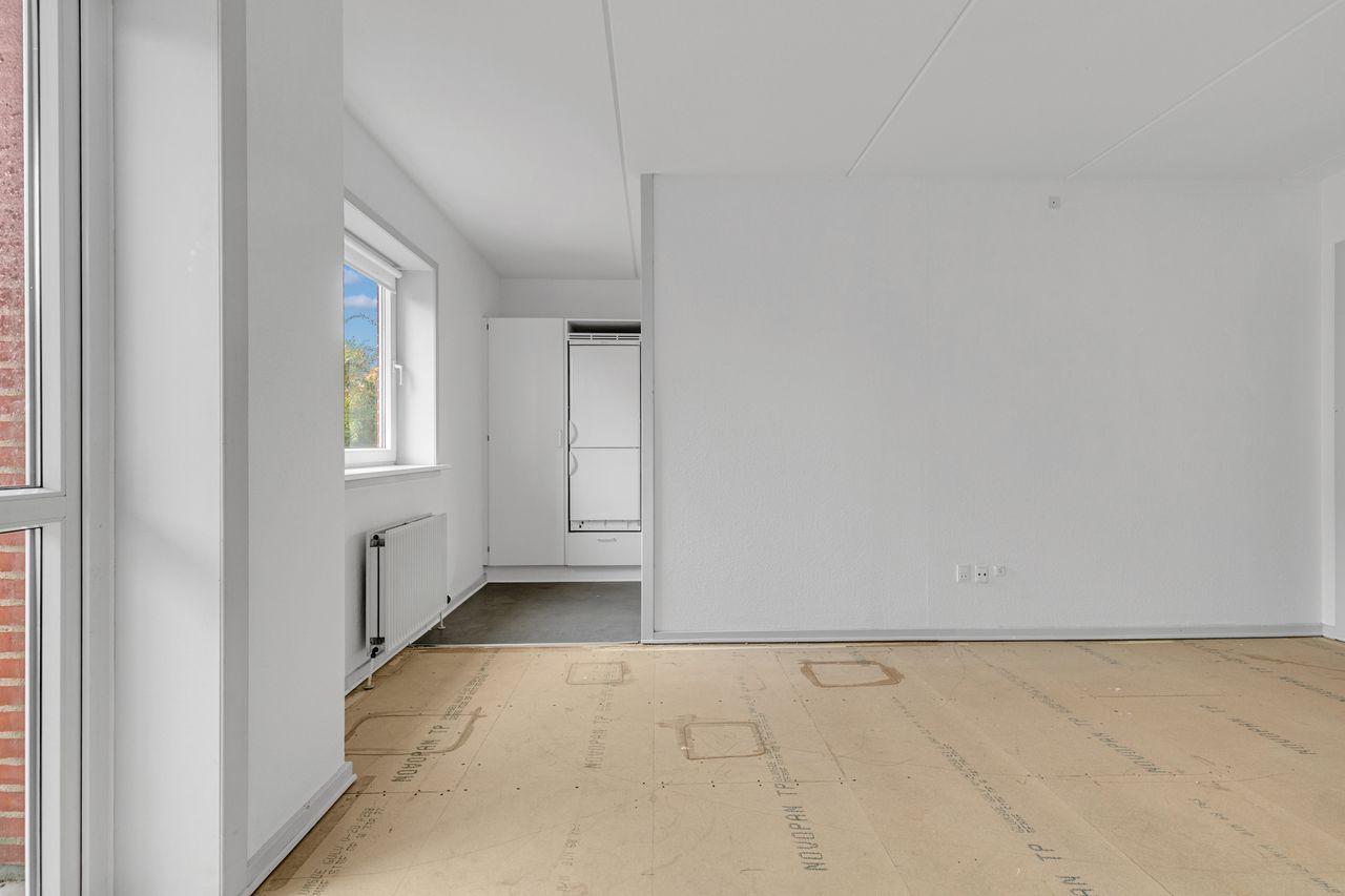 Indvendig tilbydes følgende indretning. Pæn lys entre med god plads til garderobe.
