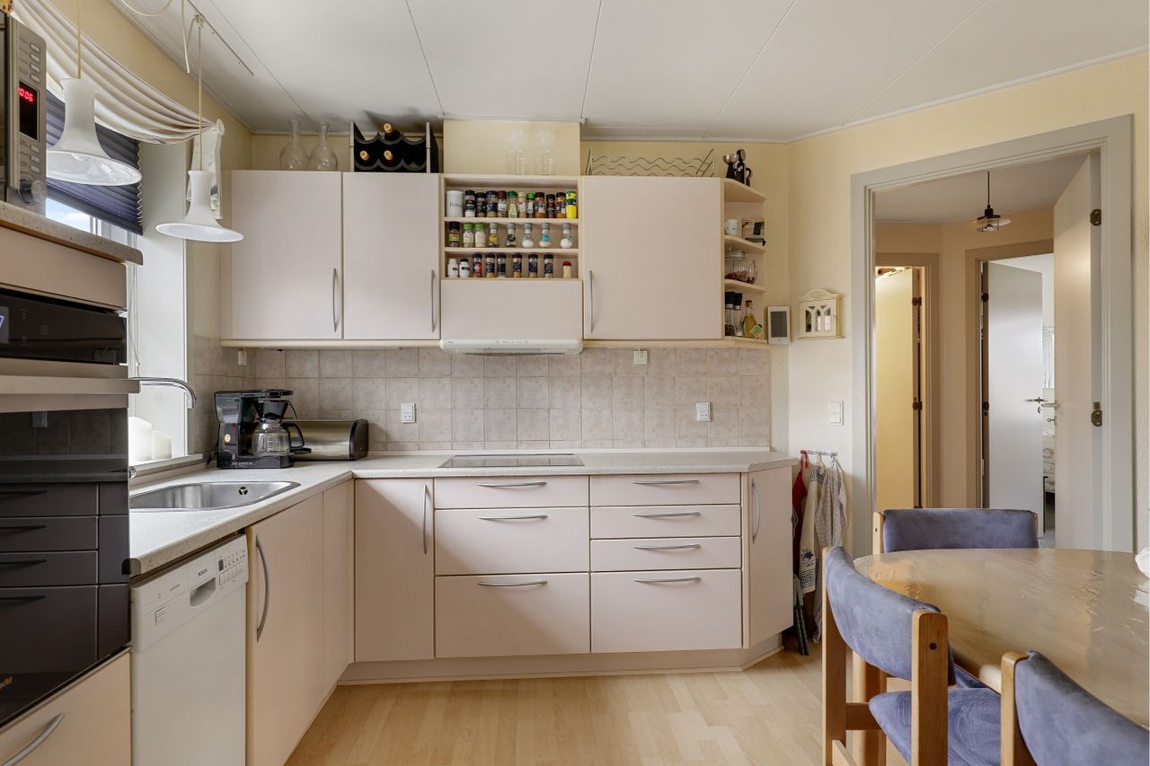 Nydeligt lyst køkken, med finerede låger, pæn bordplade, laminatgulv pålagt, samt sep. spiseplads, og