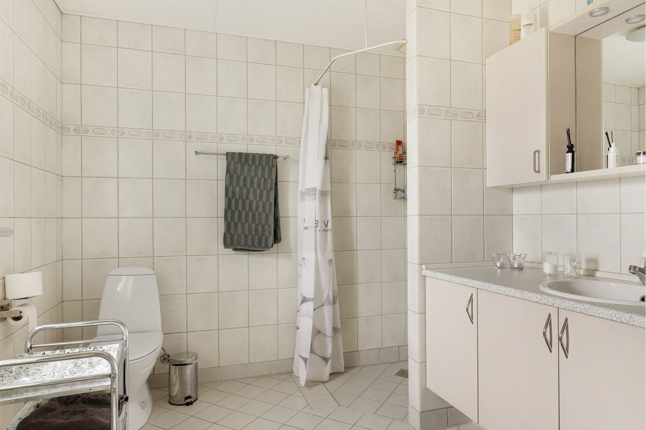 lyse klinker på væggene, stor sep. bruseniche og pænt badeværelses miljø skab, med nedfældet