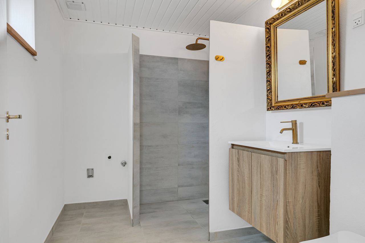 Usædvanlig flot nylavet badeværelse, med flotte klinker på gulv samt vægge i bruseniche, stor sep. bruseniche med mat. messingfinish armatur, flot badeværelses miljø skab, med nedfældet håndvask og mat. messingfinish armatur gulvvarme mv. Der er plads til vaskemaskine / tørretumbler.