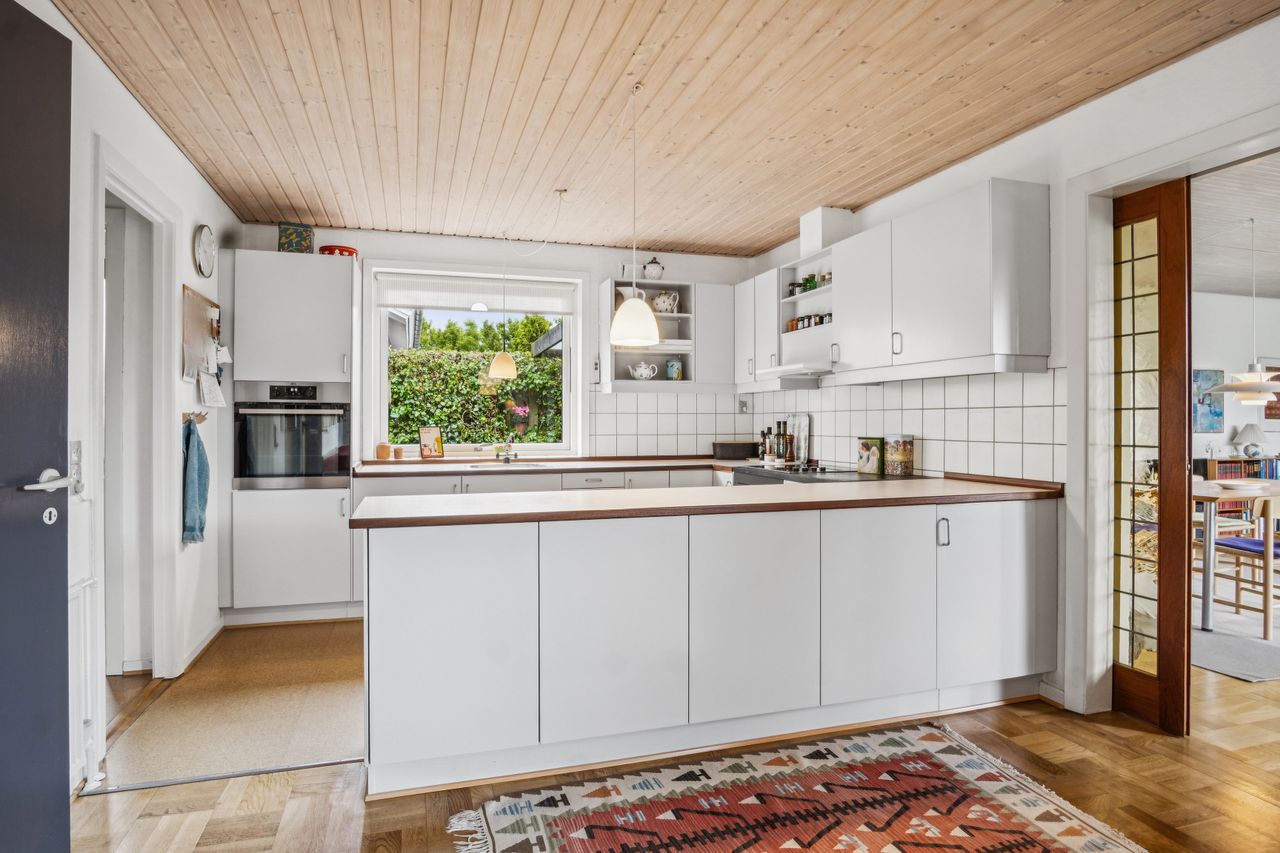 Super lækkert køkken/alrum, med stort panorama vindue til haven, god plads til stort spisebord og nydeligt lyst køkken og med skydedør isat til stuen.
