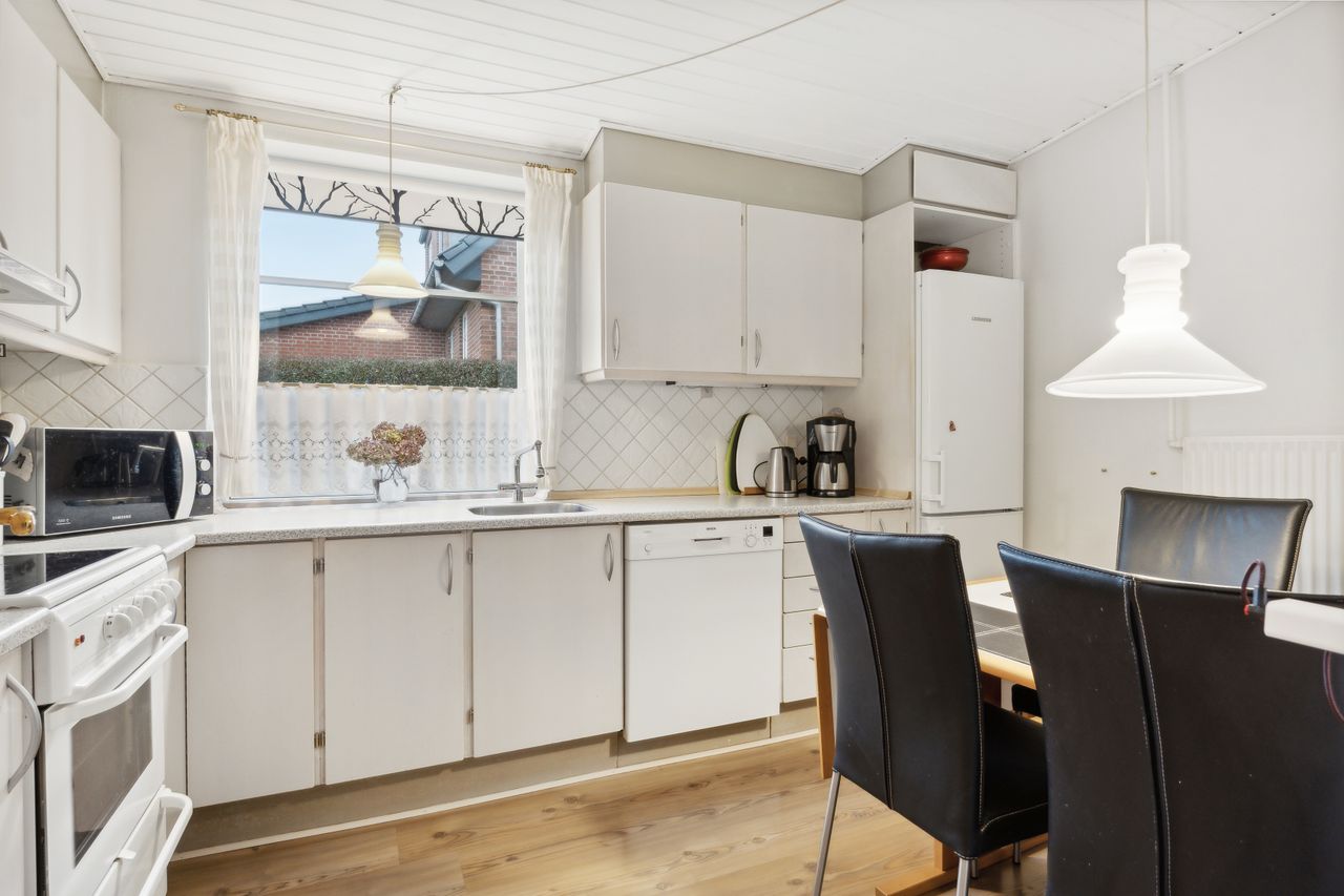 Nydeligt lyst køkken, med sep. spiseplads og pæne lyse køkkenelementer og pænt pålagt laminatgulv.