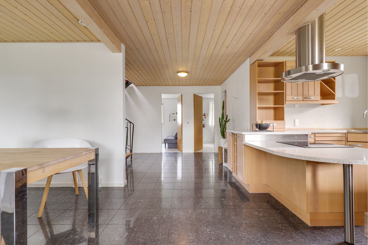 Pænt stort lyst køkken / alrum med klinkegulv og gulvvarme, hvor der er god plads til stort spisebord, pænt