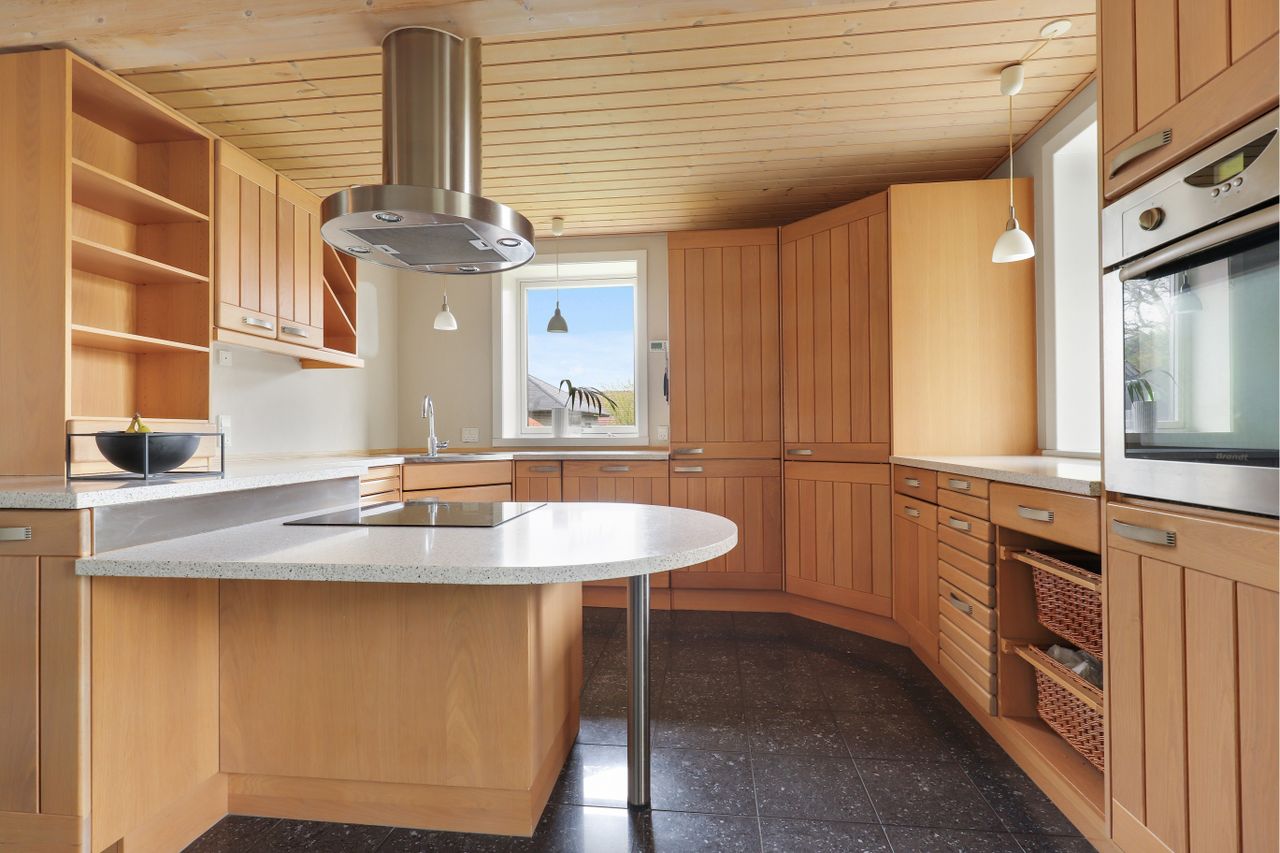 gulve, brændeovn og et stort flot vinduesparti i gavlen, hvorfra der er havudsigt, der er endvidere lavet