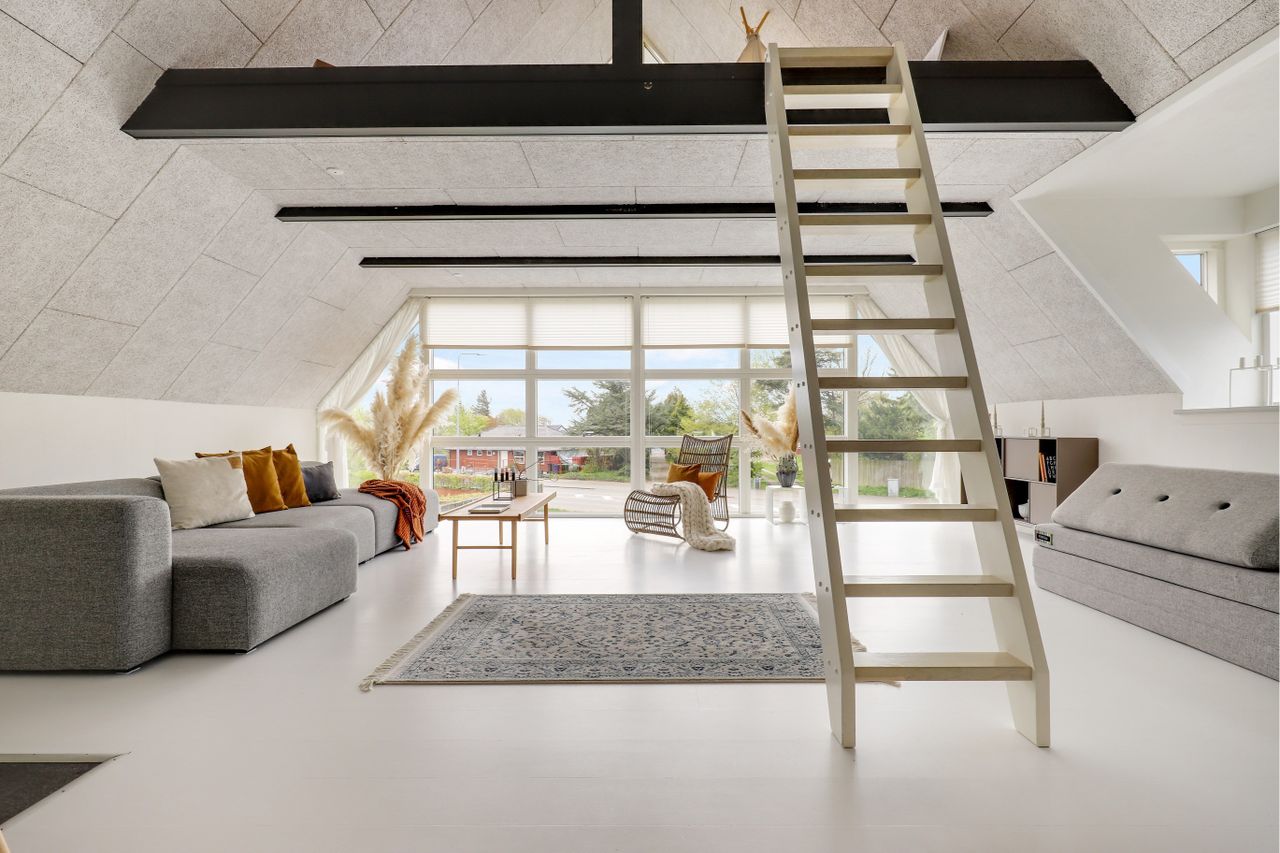 Særdeles stor lækker lys opholdsstue med synlige hanebånd, trold tekt loft ført til kip, pæn kvist, malede