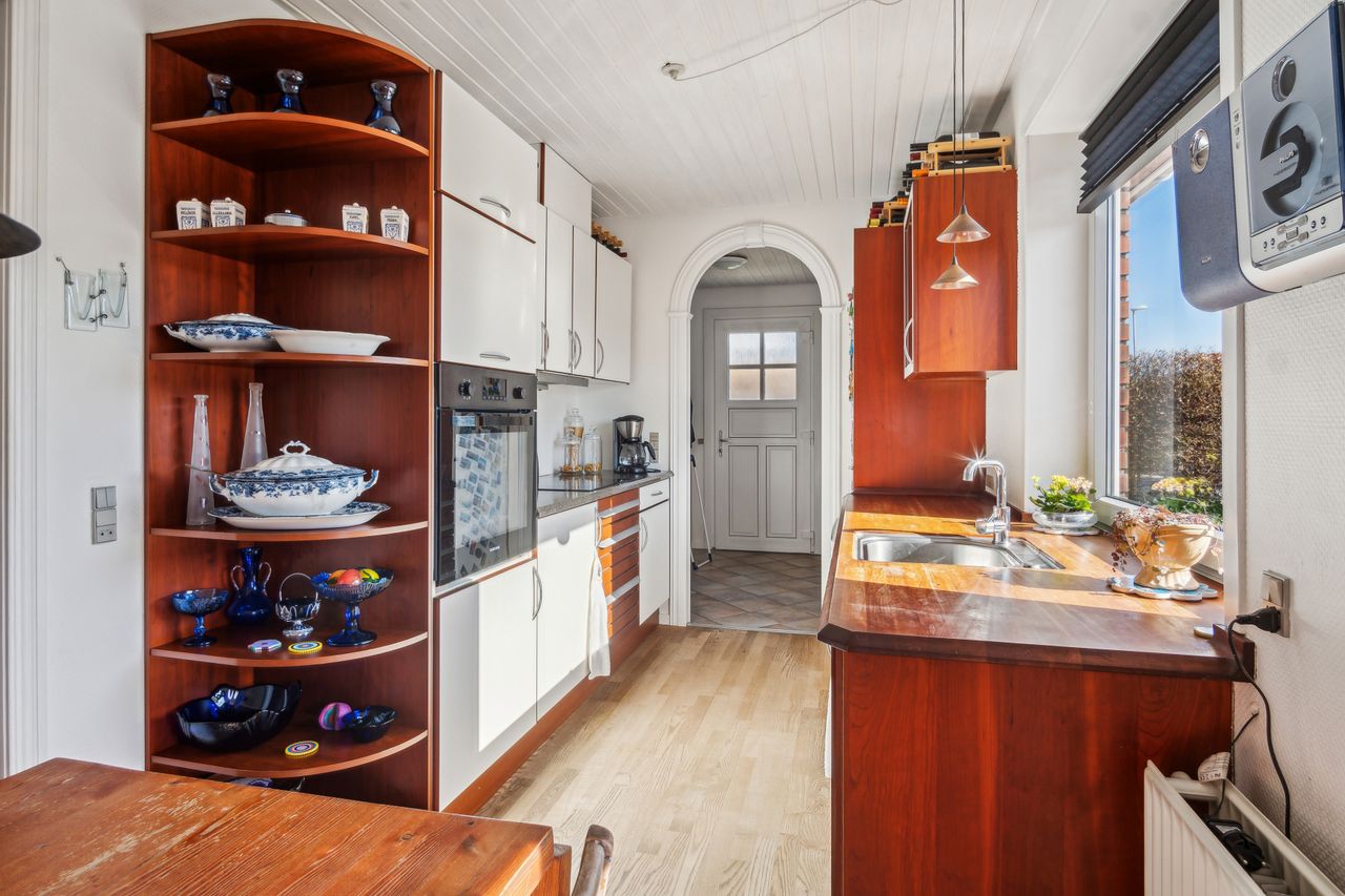 Hvidt element køkken, med kirsebær kant, massiv/ granit bordplade, lyst laminatgulv, malet rustikloft, plads til spiseplads, udgang til forhaven samt dobbelt fransk glasdør isat til stuen.