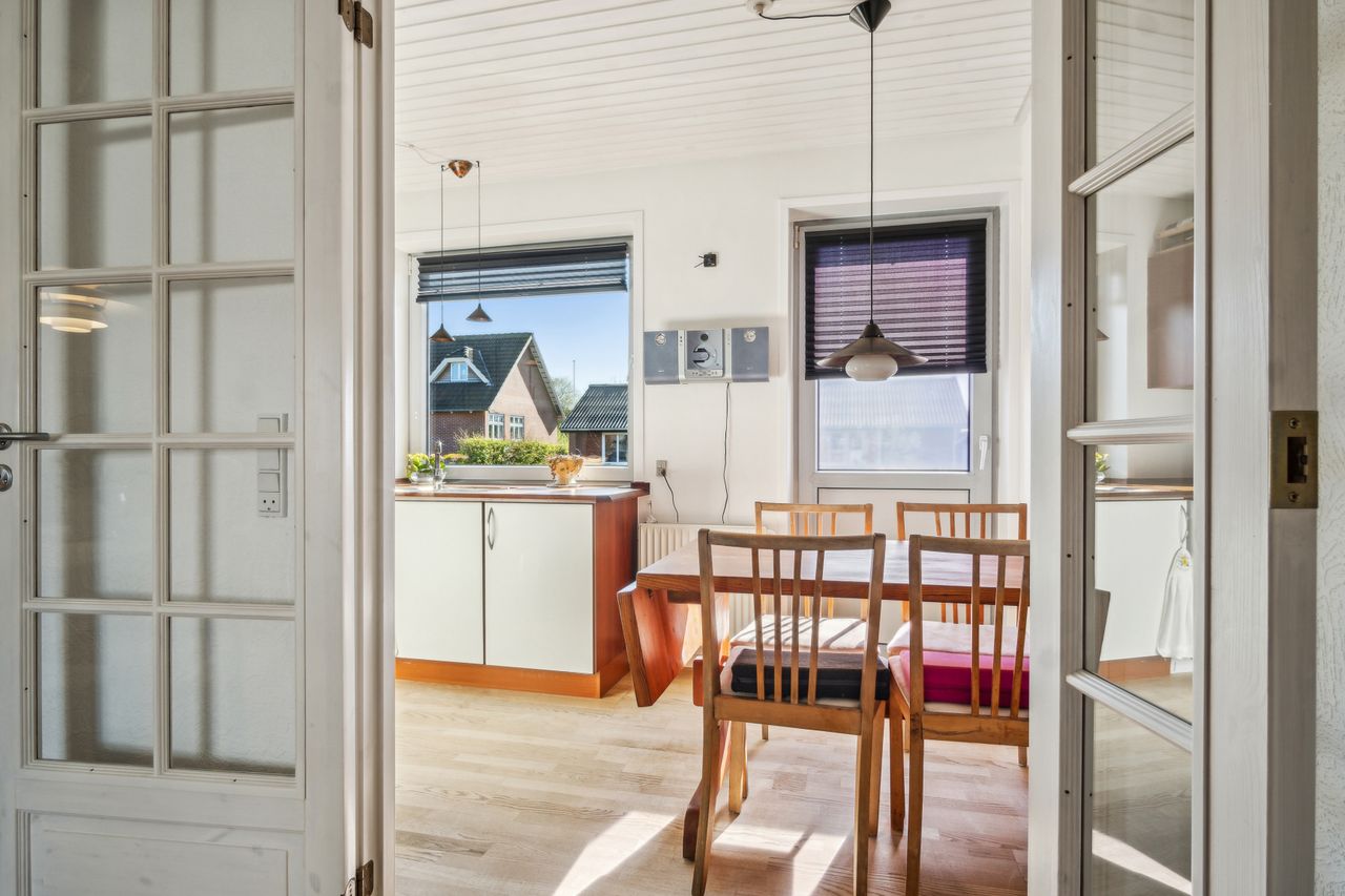 Lys stor vinkelstue, med plads til spisebord samt indretning af hyggelig opholdsstue, lyst laminatgulv samt gipsloft opsat og med udgang til udestuen samt haven.