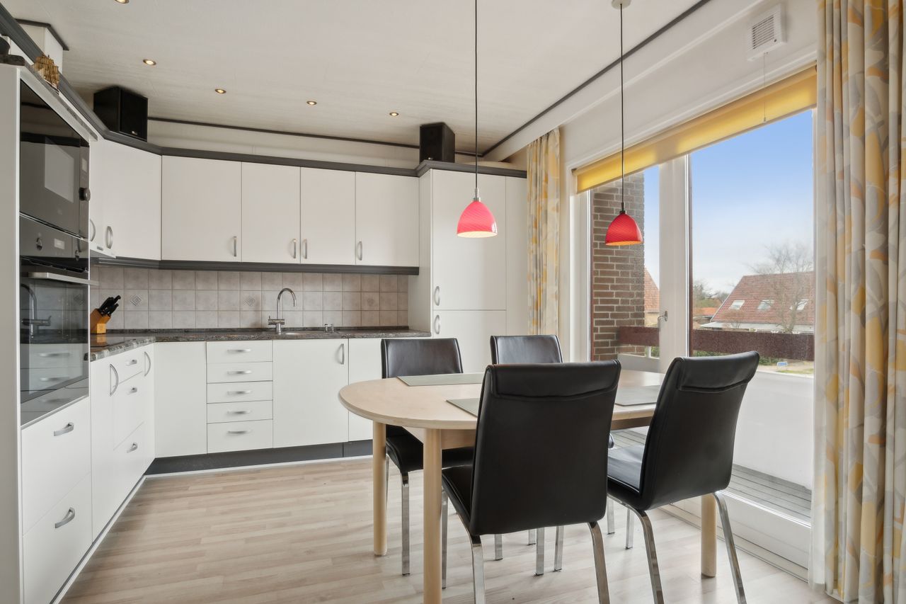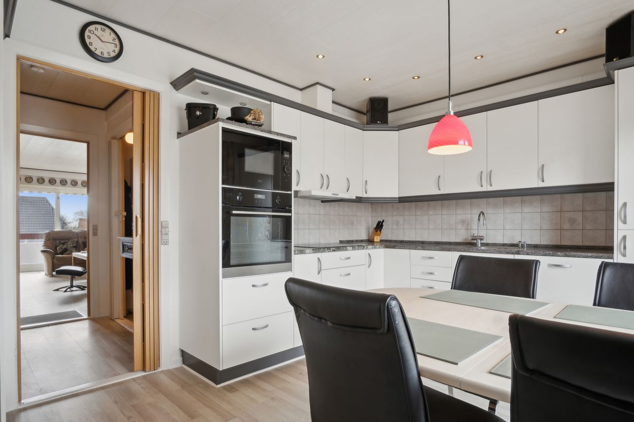 Pænt stort lyst køkken, med hvide elementer, plads til spisebord, panel struktur loft opsat, lyst laminatgulv og med udgang til skøn altan.