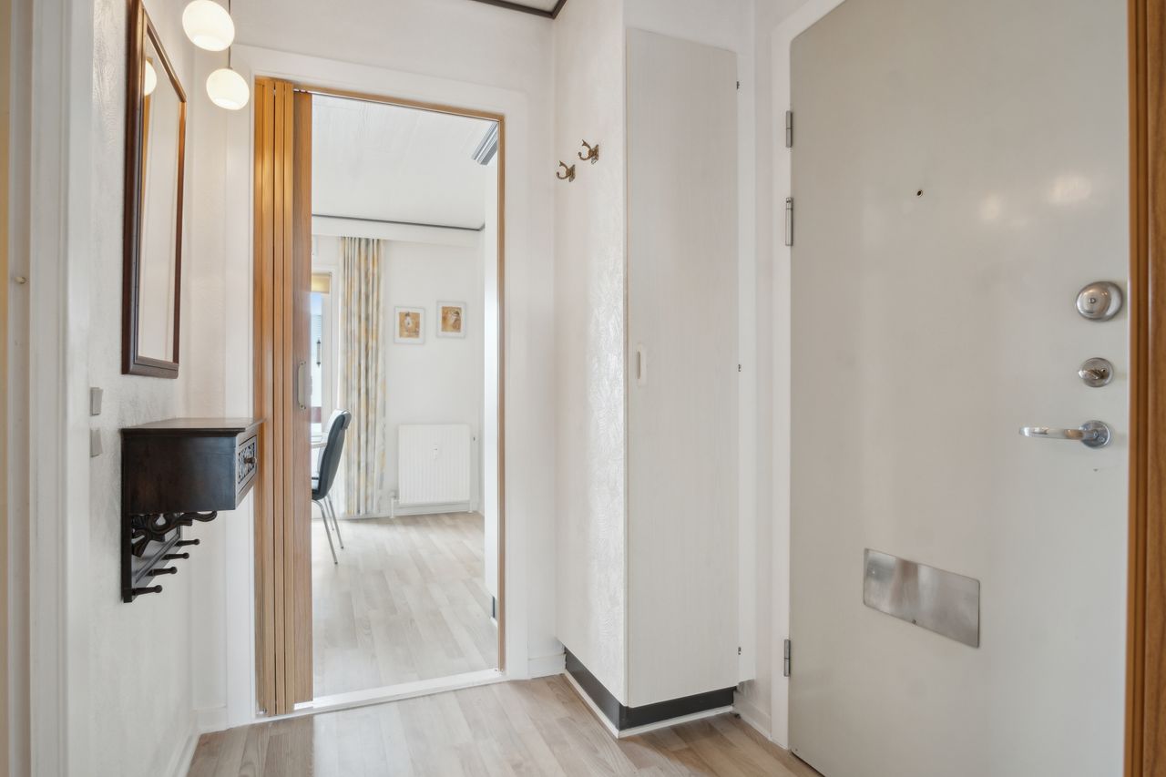 Indvendigt tilbydes følgende indretning. : Dejlig entre, med lyst laminatgulv, gips panel loft opsat, skabsplads samt god plads til garderobe.