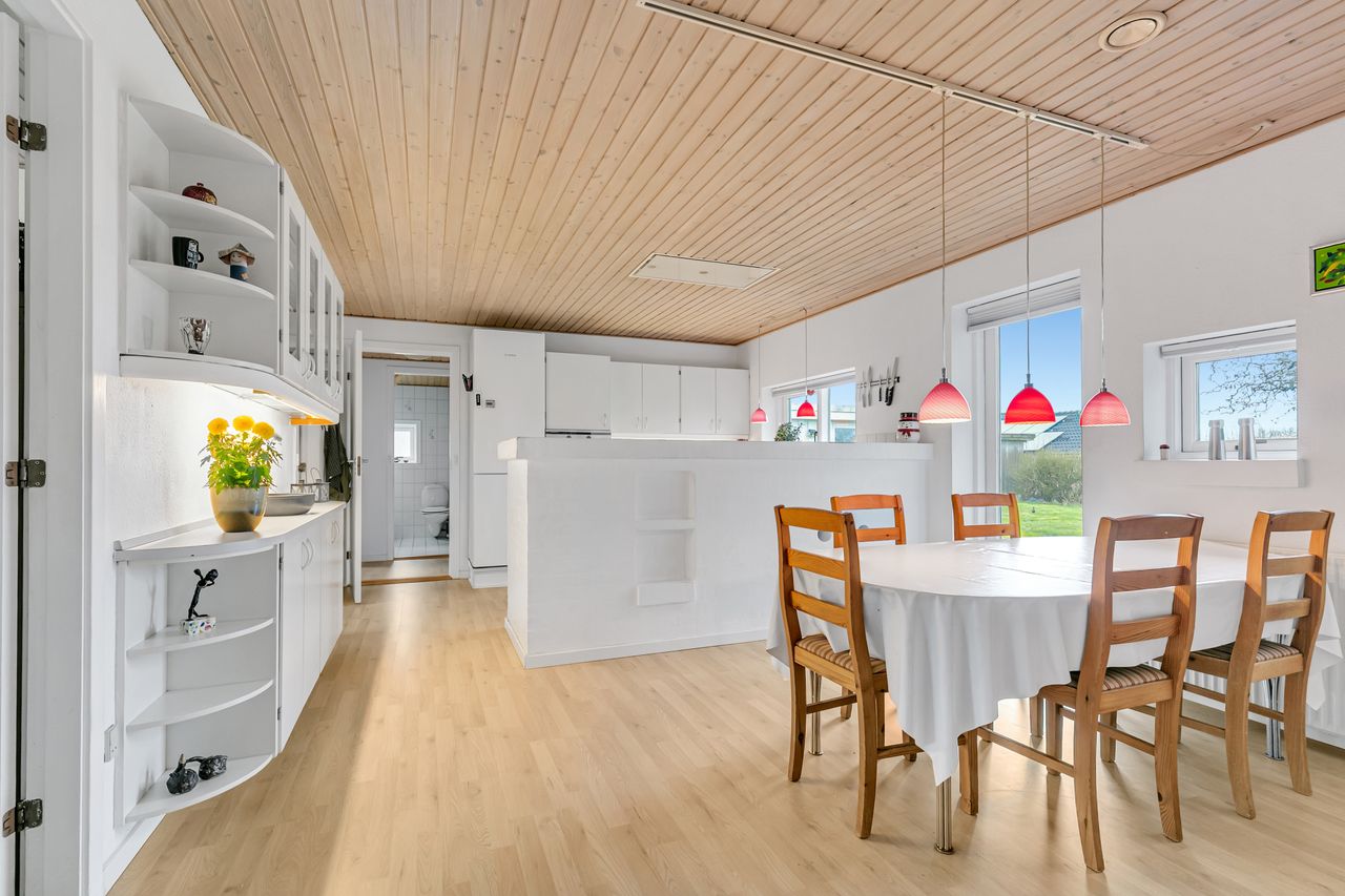Stort lyst køkken/alrum, med hvidt køkken og muret halvvæg til alrummet, hvor der er plads til stort spisebord og med udgang til fliseterrasse samt haven.