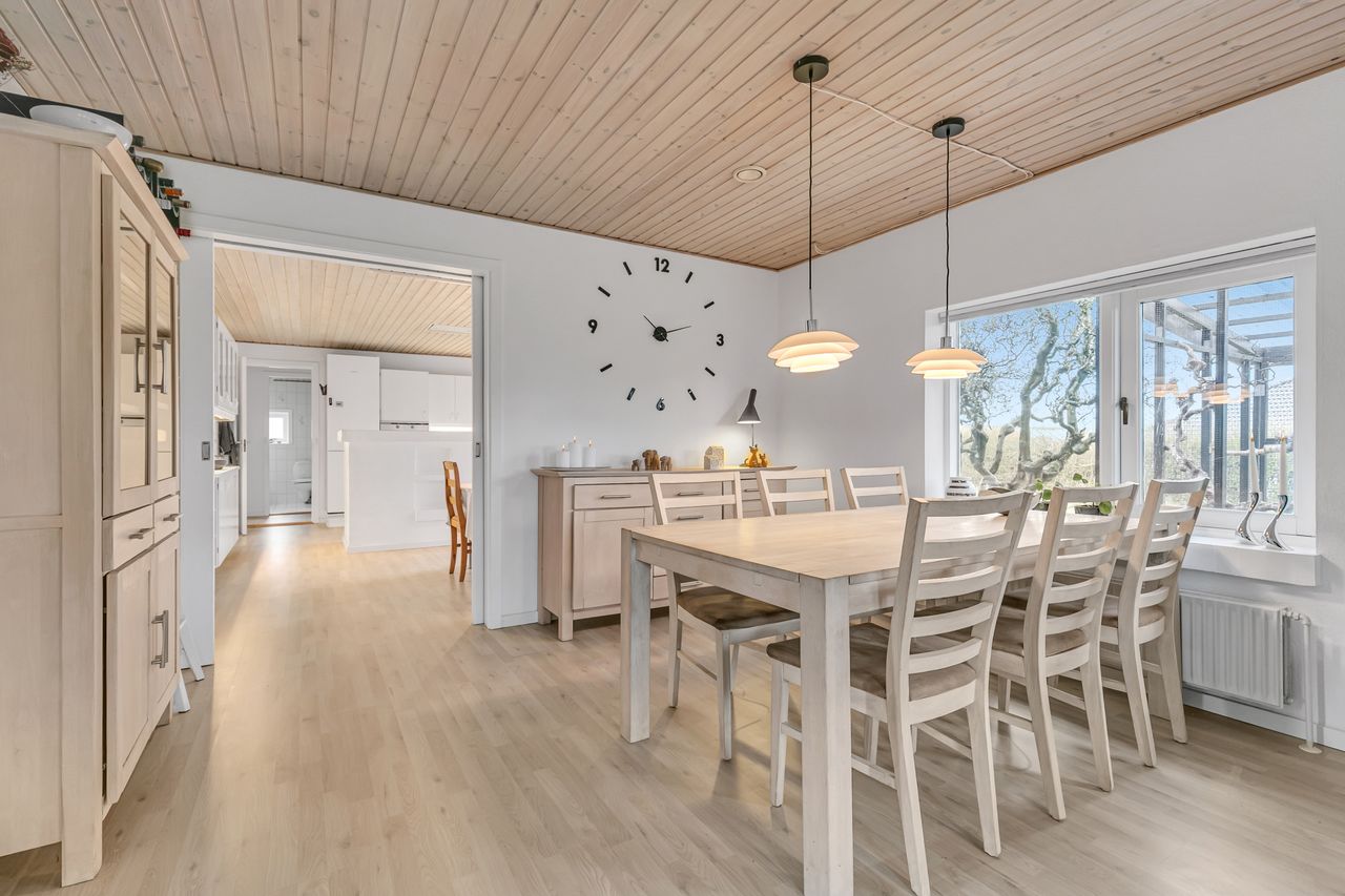 Der er isat dobbelt skydedør til den store lyse stue, hvor der er plads til stort spisebord samt indretning af hyggelig opholdsstue, der er pålagt et lyst laminatgulv.