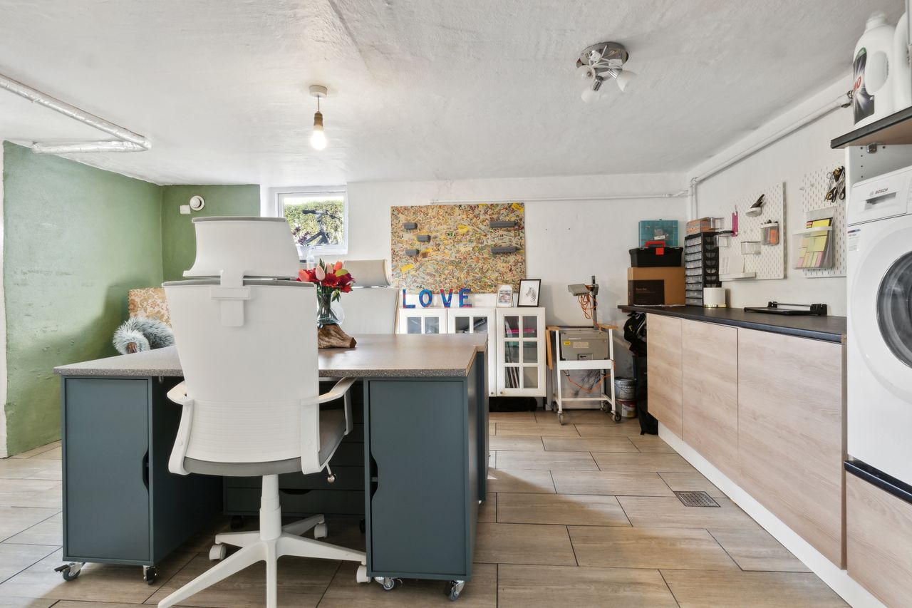 1 stort lyst disp. rum med nydeligt klinkegulv, plads til vaskemaskine & tørretumbler samt med udgang til haven.