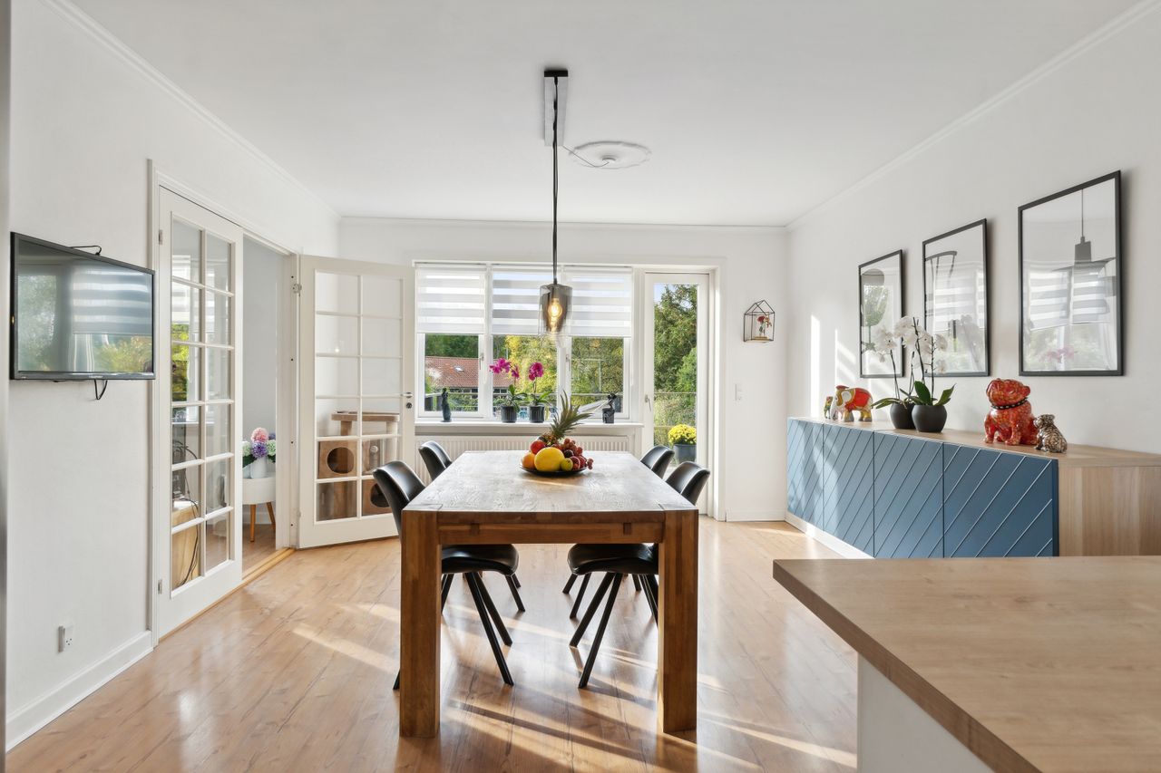 Skøn lys hyggelig opholdsstue, med flot dobbelt fransk dør isat mod køkken/alrum.