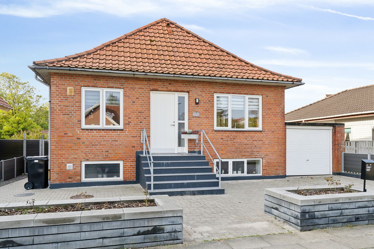 Arkitektonisk 1 plans villa med høj kælder på 146 etagem2 + garage i Østerbyen, med gåstand til skole, indkøb samt natur