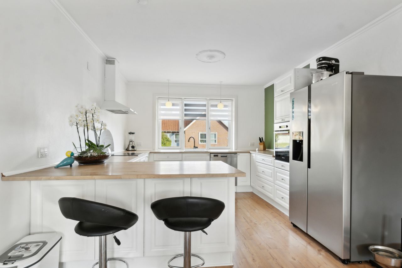 Lækkert stort lyst køkken / alrum, med et hvidt elementkøkken og en nydelig bordplade med " trælook", plads til stort spisebord, nydeligt laminatgulv og gipsloft med kunststuk, udgang til skøn ophævet stor solrig træ terrasse samt haven.