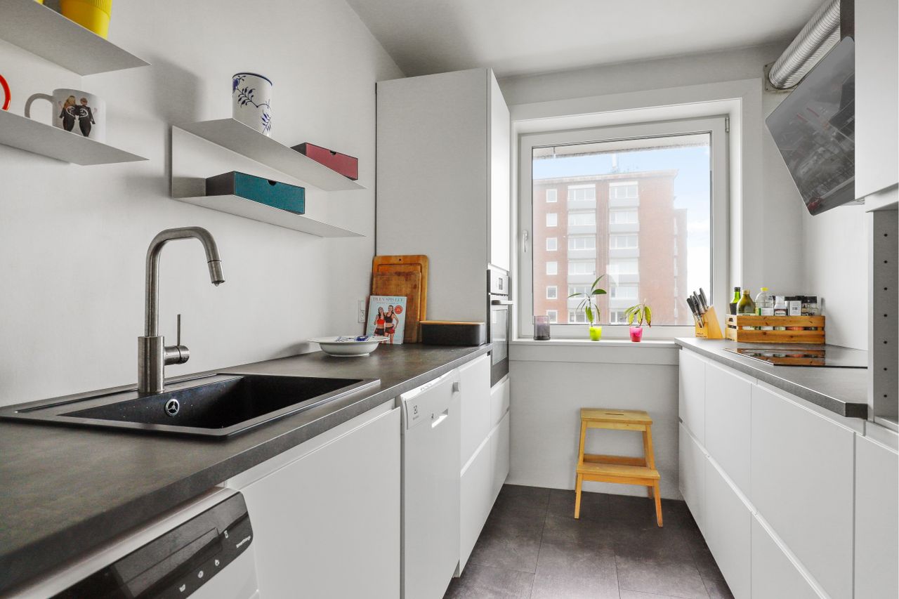 Super flot køkken med hvide elementer, mørk bordplade, nydeligt klikgulv, opvaskemaskine samt plads til