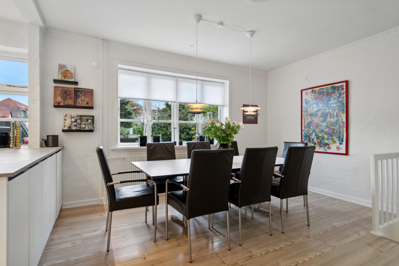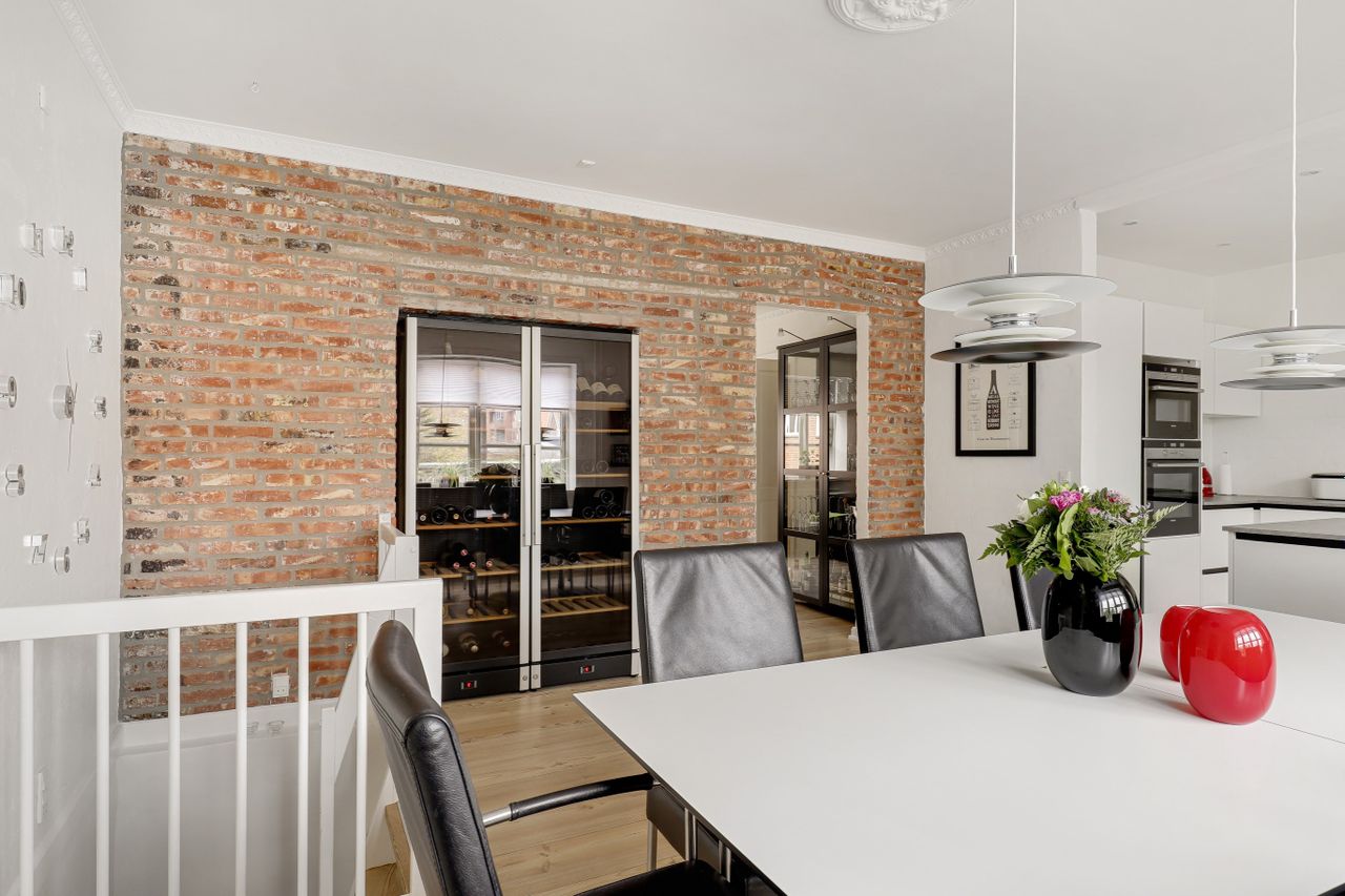 · Stort, hvidt køkken med grå bordplade, som åbner op til en imponerende spisestue. Her er plads til et stort spisebord, og der er to integrerede vinkøleskabe i en trendy "New Yorker"-væg. Fra køkkenet er der nedgang til haven.