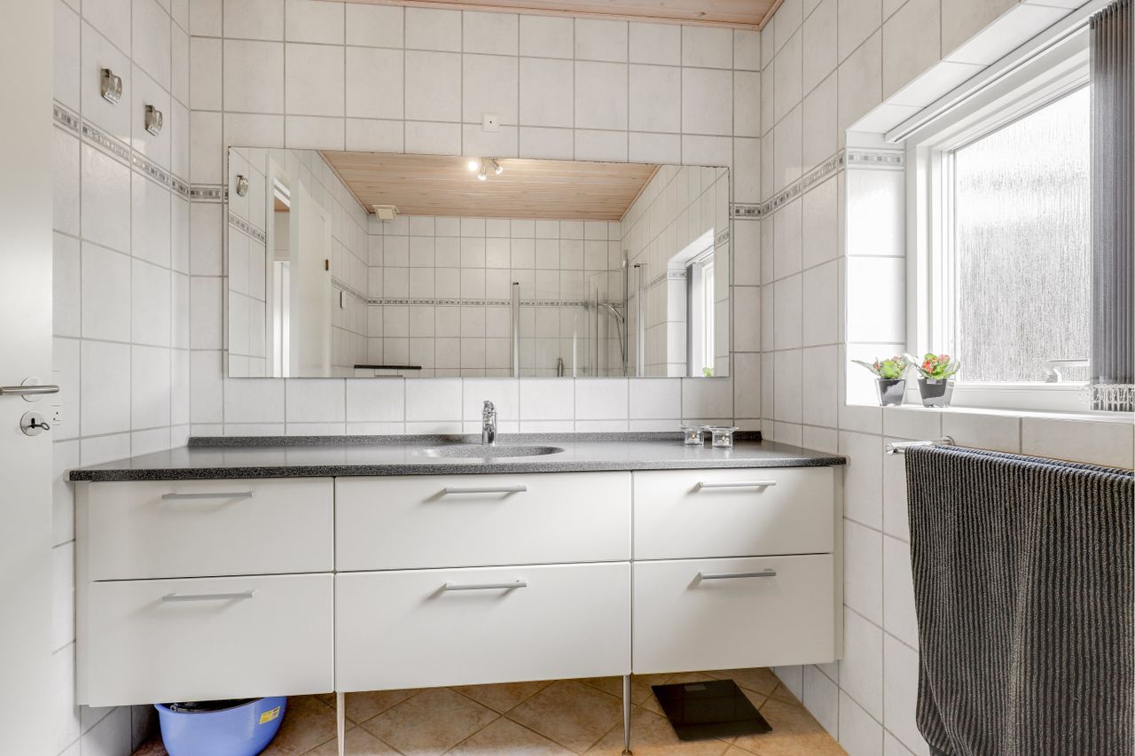 Flot lyst badeværelse, med flot hvidt badeværelses miljø skab, med nedfældet håndvask, diagonalt