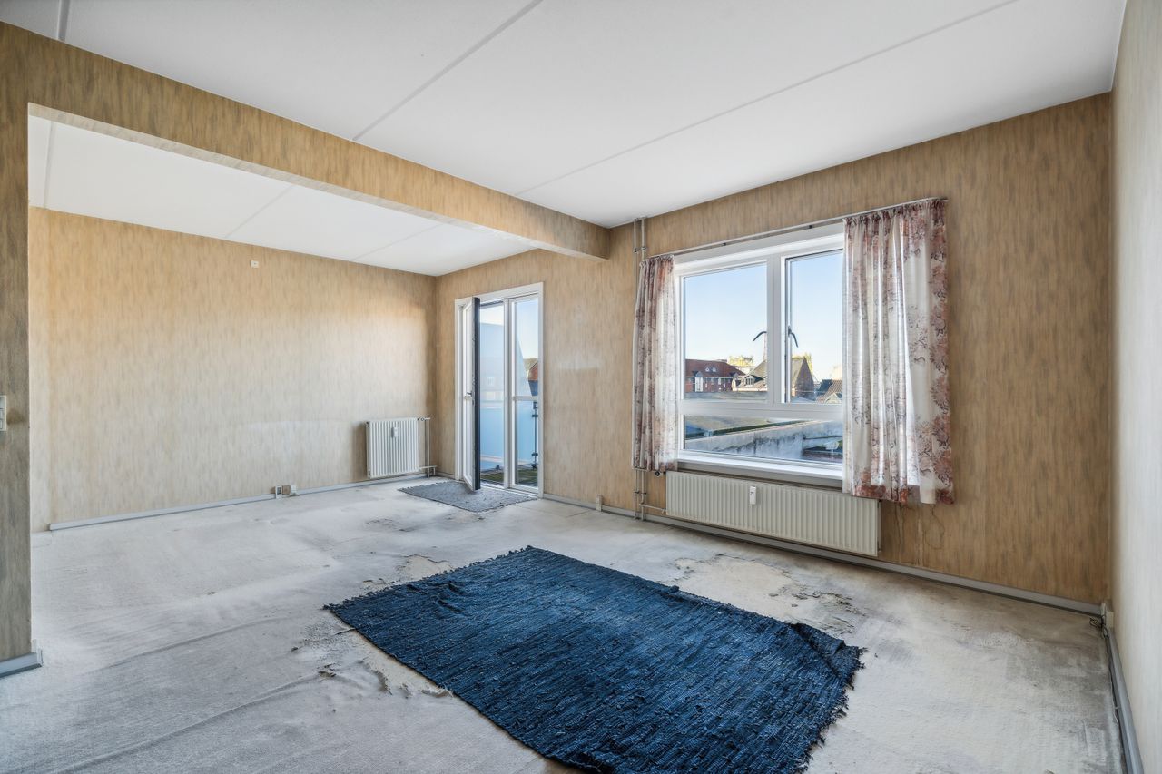 Hele Andelsboligen trænger til renovering, med nye laminatgulve samt nyt køkken og hårde hvidevarer.