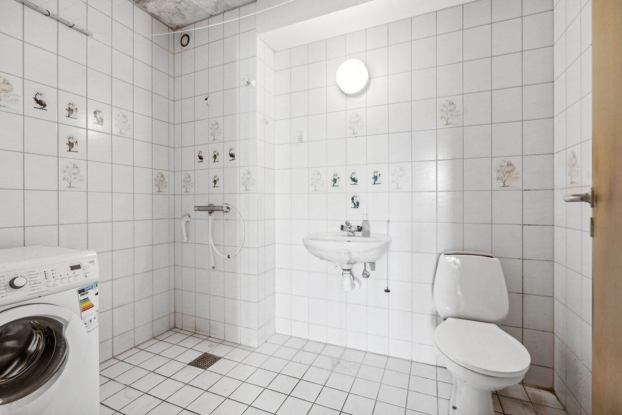 Stort lyst badeværelse med ensfarvede klinker på vægge samt gulv, sep. bruseniche, gulvvarme og plads til vaskemaskine & tørretumbler.