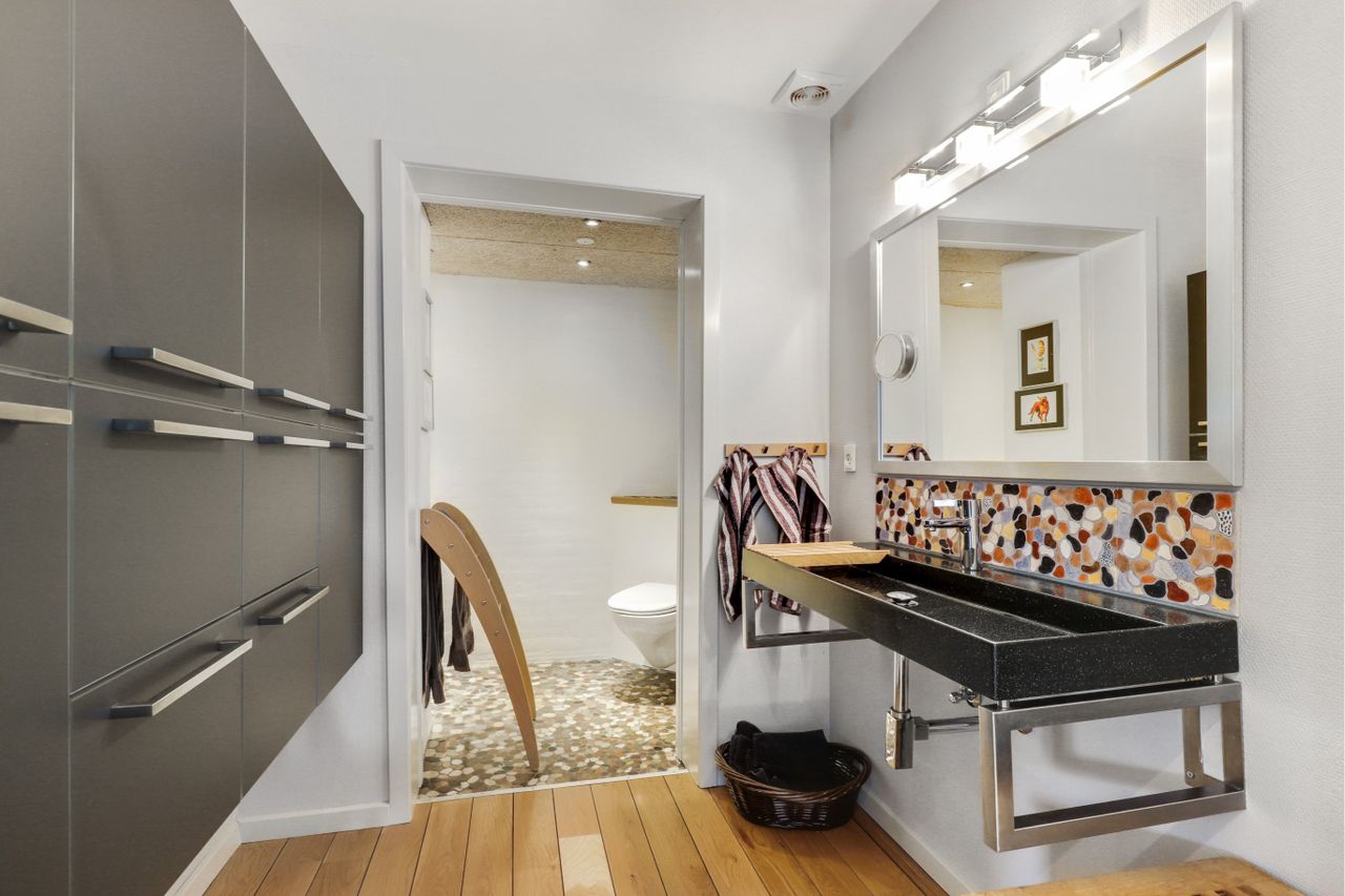 god skabsplads, ophængt toilet samt en særdeles flot buet bruseniche, som skal opleves !