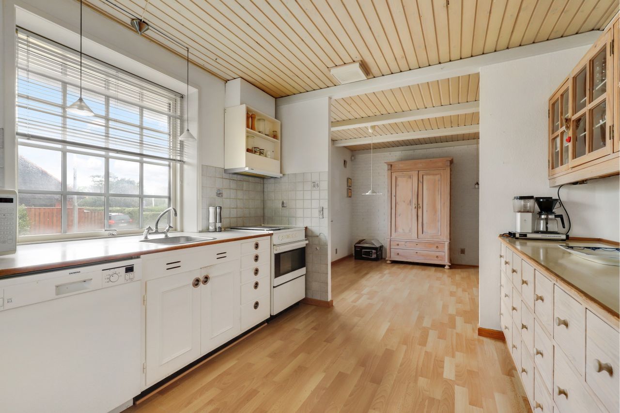 Stort køkken med ældre element køkken, og med tilhørende alrum, hvor der er plads til spisebord, der er desuden mulighed, for at vælte væggen til spisestuen, så der kan indrettes stort lyst køkken/alrum, der er isat fransk dobbeltdør til spisestuen nu.
