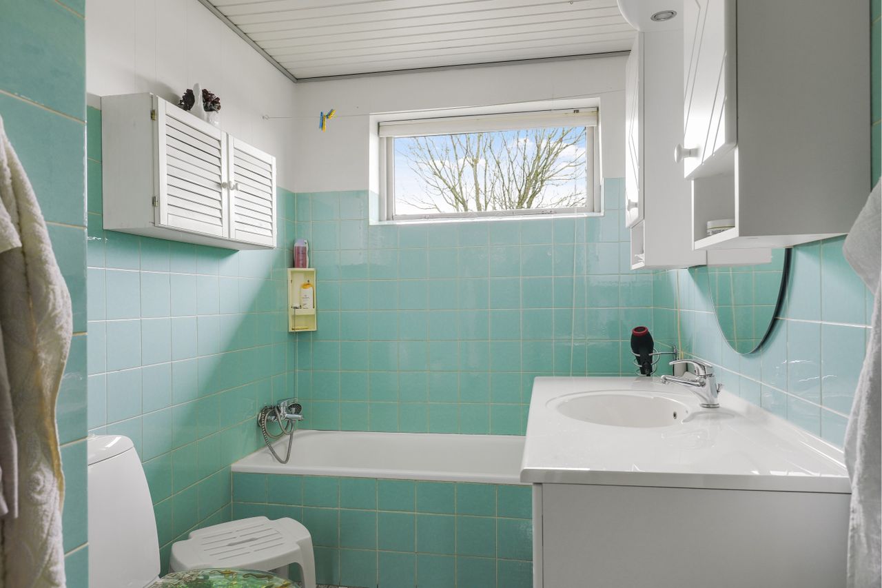 Badeværelse, med mossaik klinkegulv, liggekar, ensfarvede klinker på vægge, toilet samt håndvask.