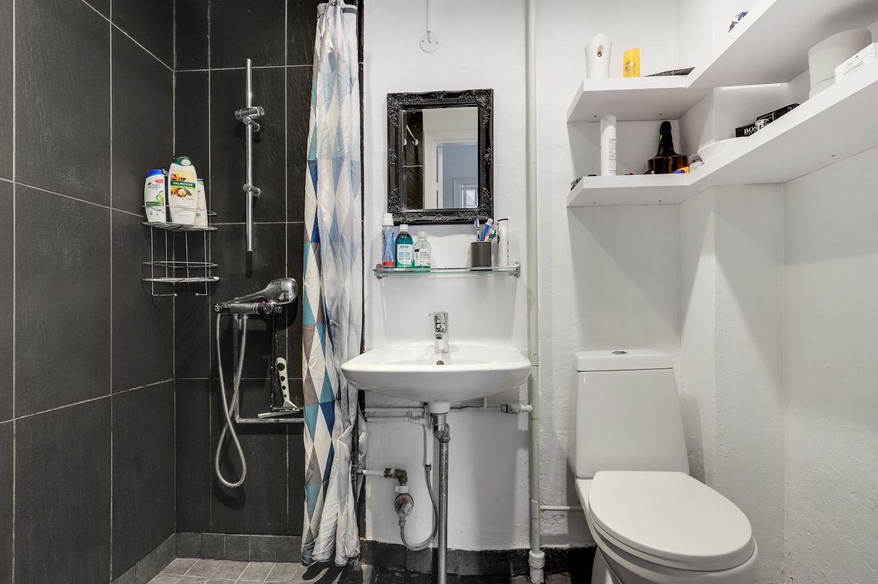 Pænt stort badeværelse med sep. bruseniche, toilet samt håndvask.