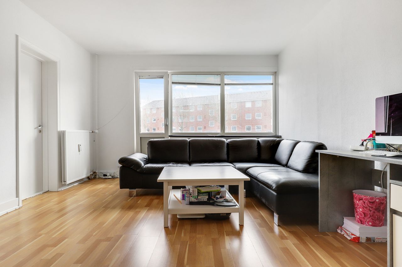 Stor lys opholdsstue med gode møblerings muligheder og med udgang til solrig altan.