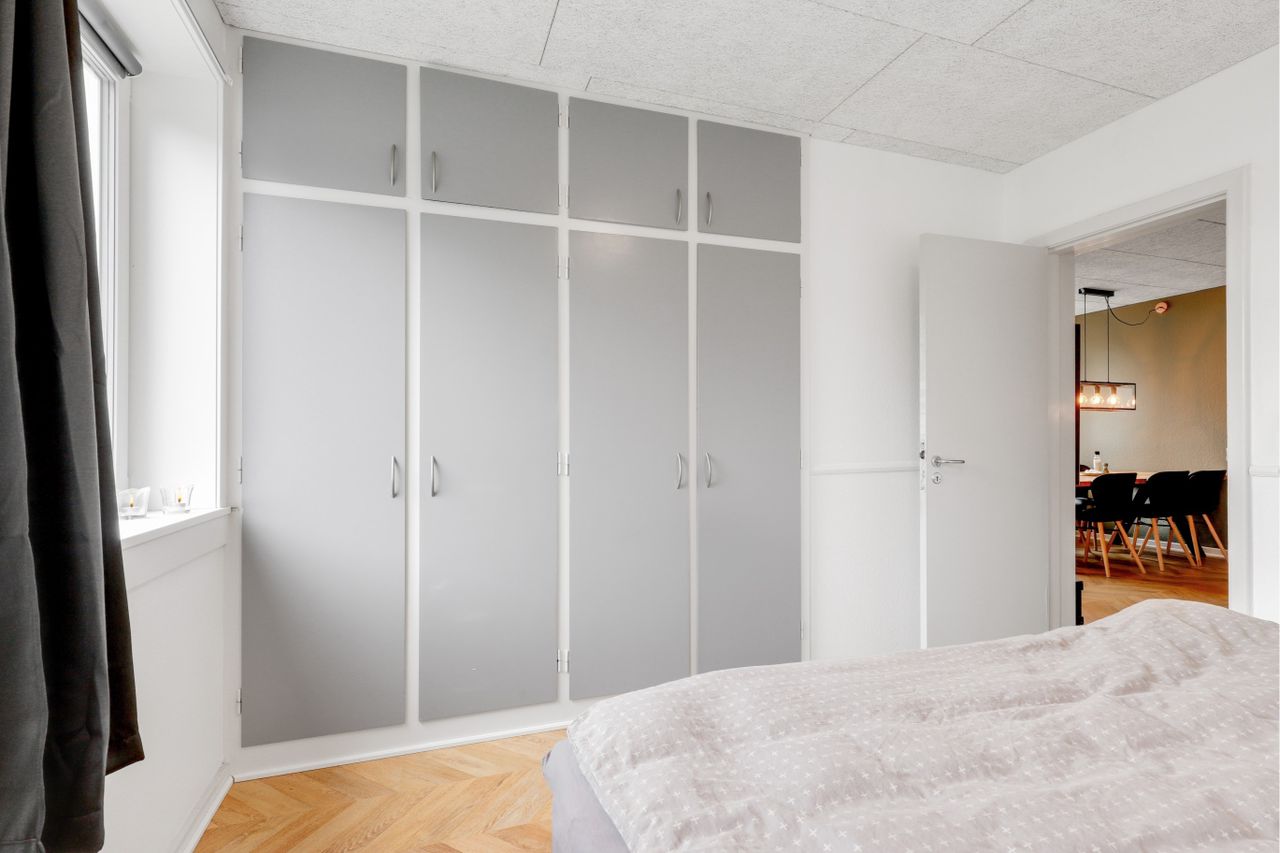 Skønt stort lyst soveværelse, med mange indbyggede skabe, " troldtekt " loft opsat, samt pænt " sildebens