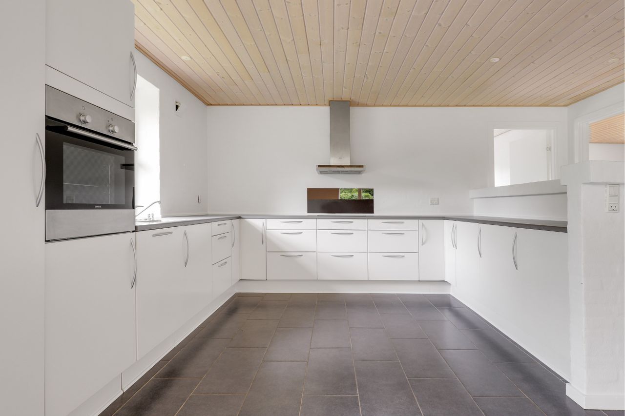 Indvendig tilbydes følgende indretning : Stort lyst bryggers med hvide skabe, håndvask med pæn mørk