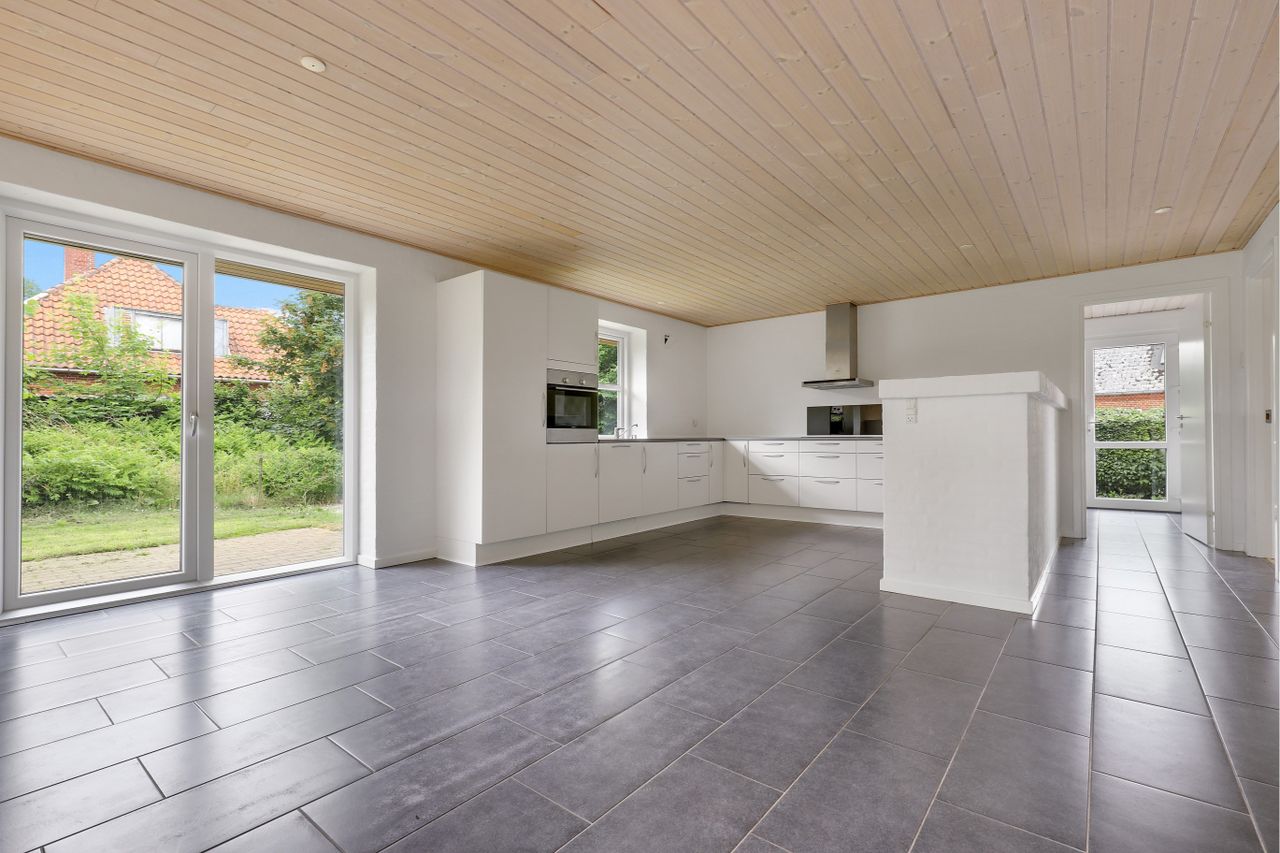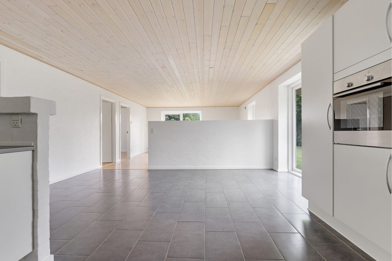 særdeles god plads til stort spisebord og med udgang til haven. Fra køkkenet er der muret halvvæg op