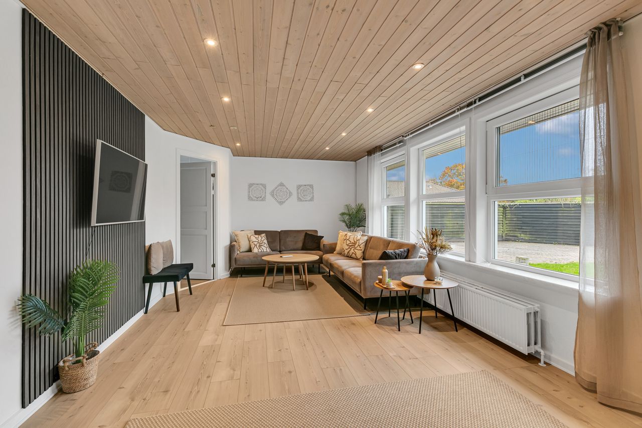 Dejlig stor lys opholdsstue, med udgang til haven samt overdækket terrasse , lyst laminatgulv, flot opsat akustikpanelvæg og rustikloft med indbygningsspots.