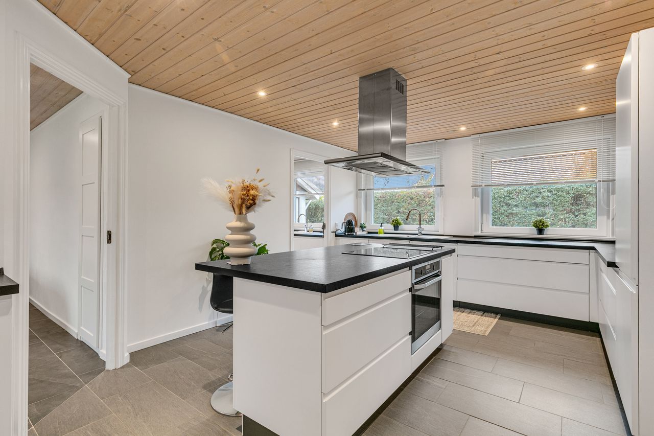 Stort særdeles flot køkken/ alrum, med et flot hvidt køkken, mørk bordplade, stor køkkenø, mørkt klinkegulv, med gulvvarme, rustikloft med indbygningsspots og plads til stort spisebord. Fra køkkenet er der isat dobbelt fransk glasdør til stuen.