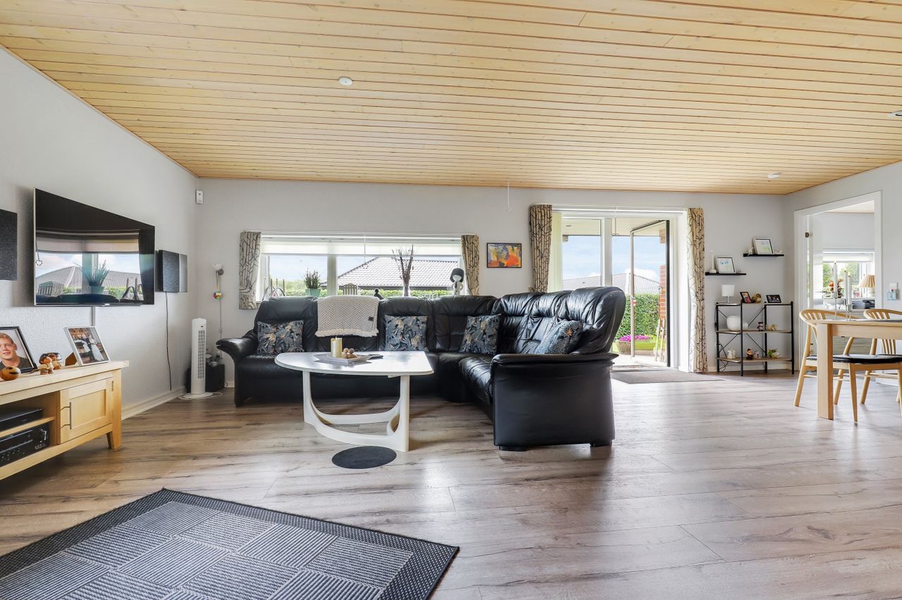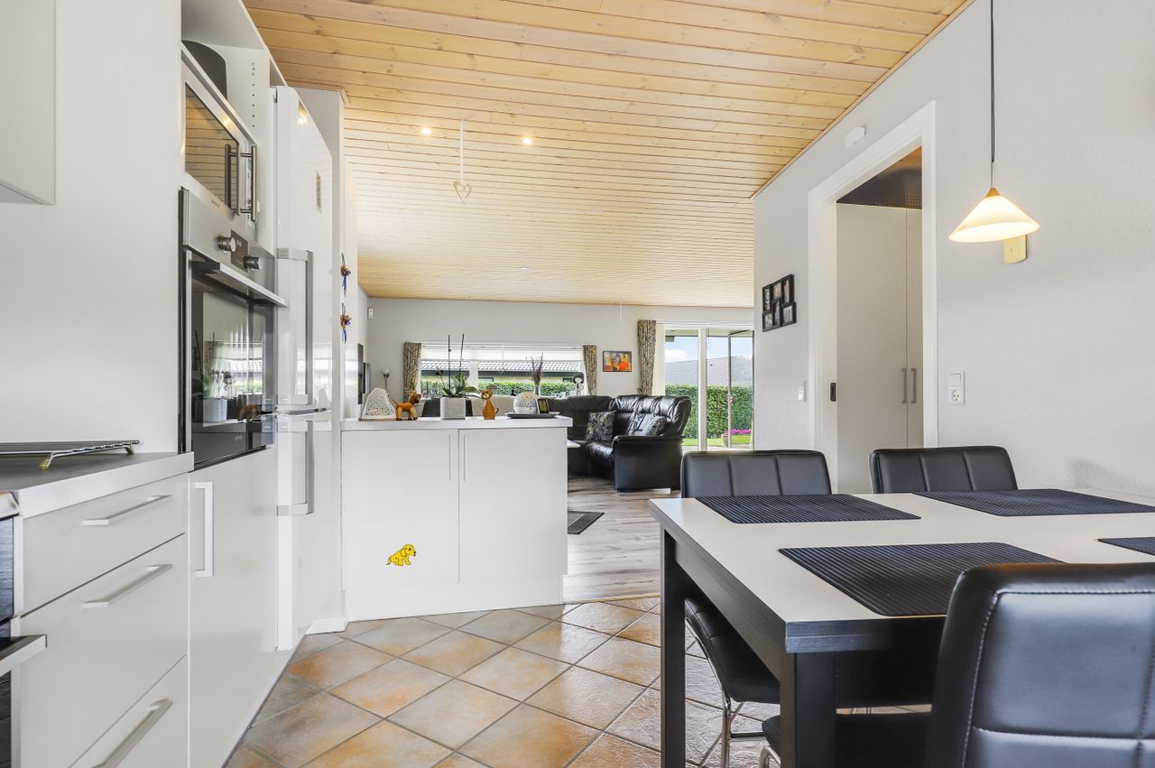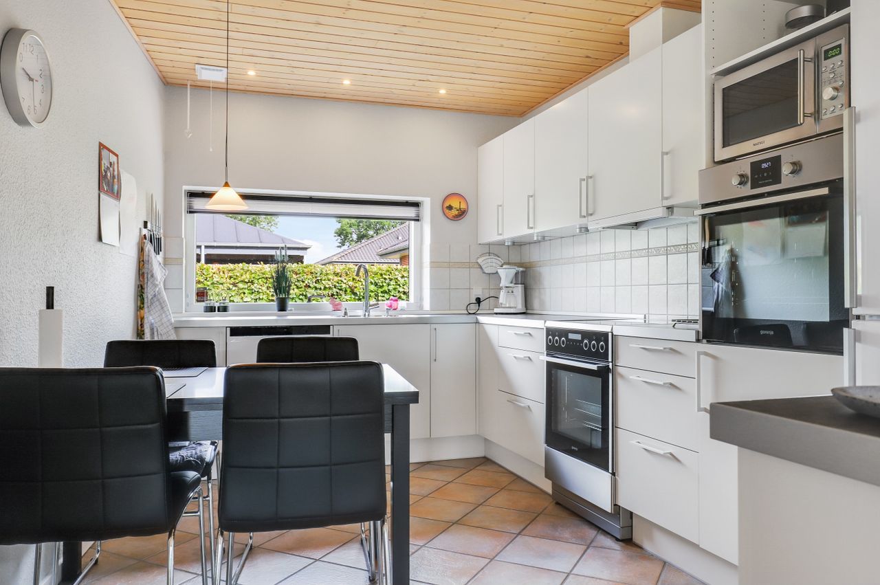 Flot lyst køkken i åben forbindelse til den skønne lyse stue med god plads til opholdsstue samt spiseafdeling og med pænt laminat gulv. Køkkenet er med hvide elementer samt med smuk bordplade og der er plads til mindre spisebord i køkkenet. fra stuen er der udgang til den skønne have samt terrasse og der er aut. markise som kan betjenes med fjernbetjening.