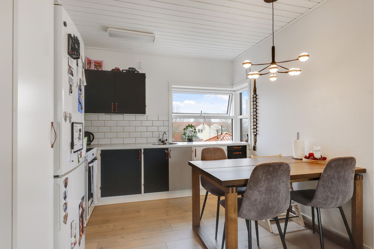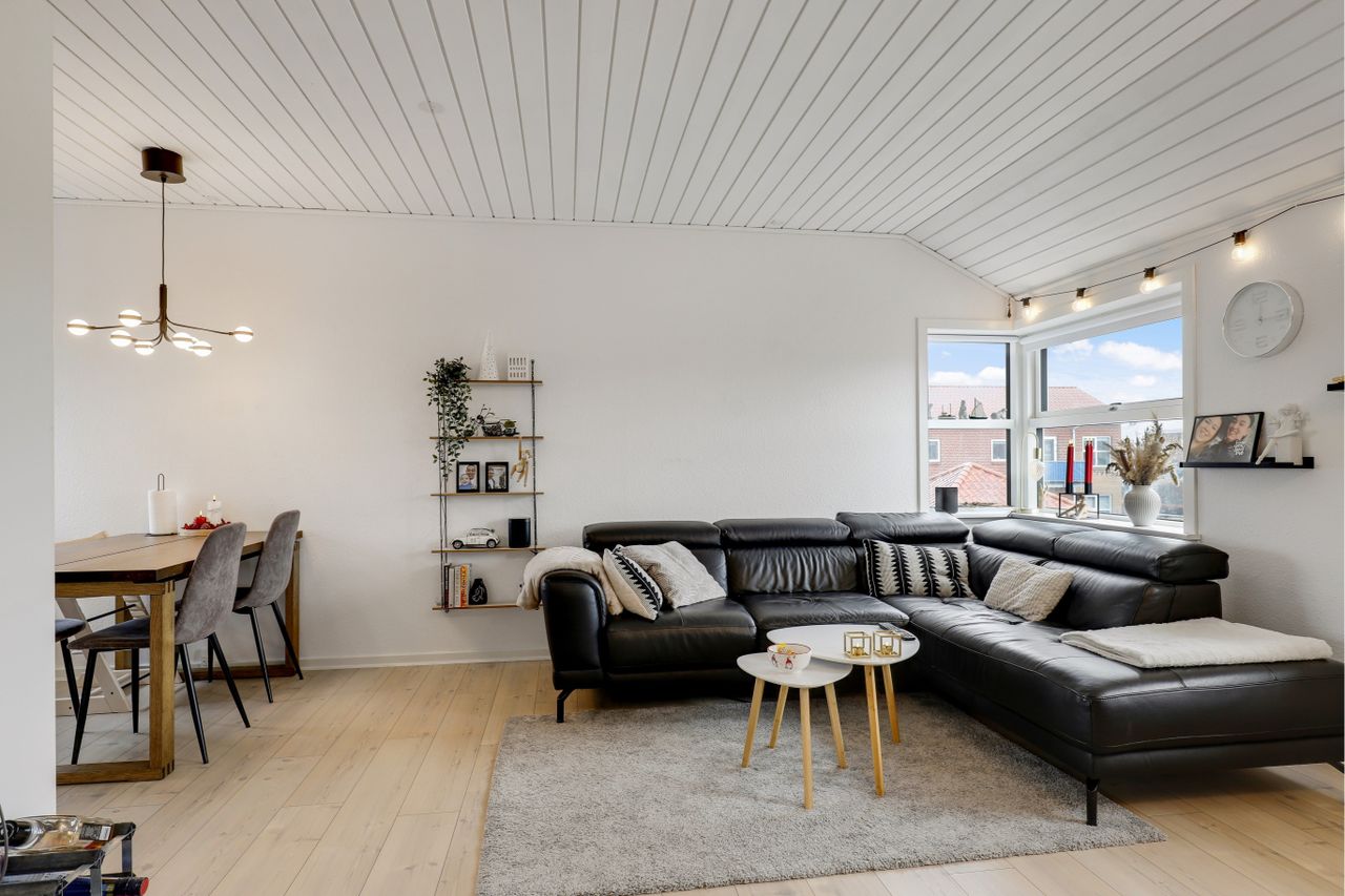 er i åben forbindelse til den store hyggelige møblerings venlig lyse stue, som har malet rusikloft.