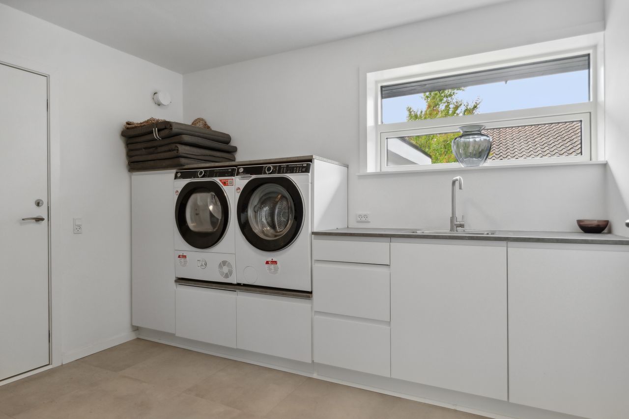 Stort flot bryggers, med skabsplads, håndvask og vaskemaskine & tørretumbler i rigtig arbejdshøjde, flot klinkegulv samt udgang til baghaven.