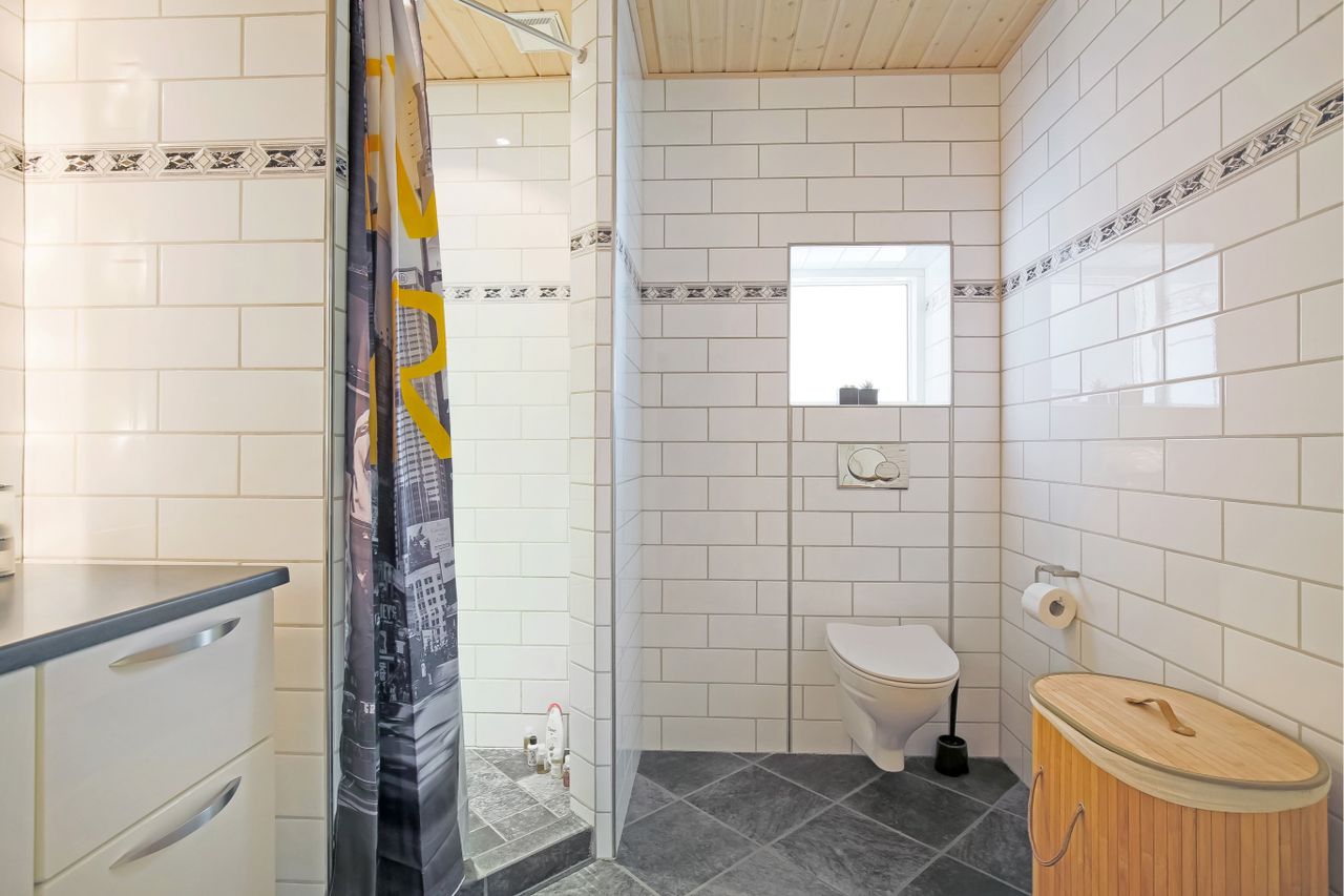 med flotte lyse klinker på væggene, samt flot mørkt klinkegulv og med lyse badeværelses miljø skabe,