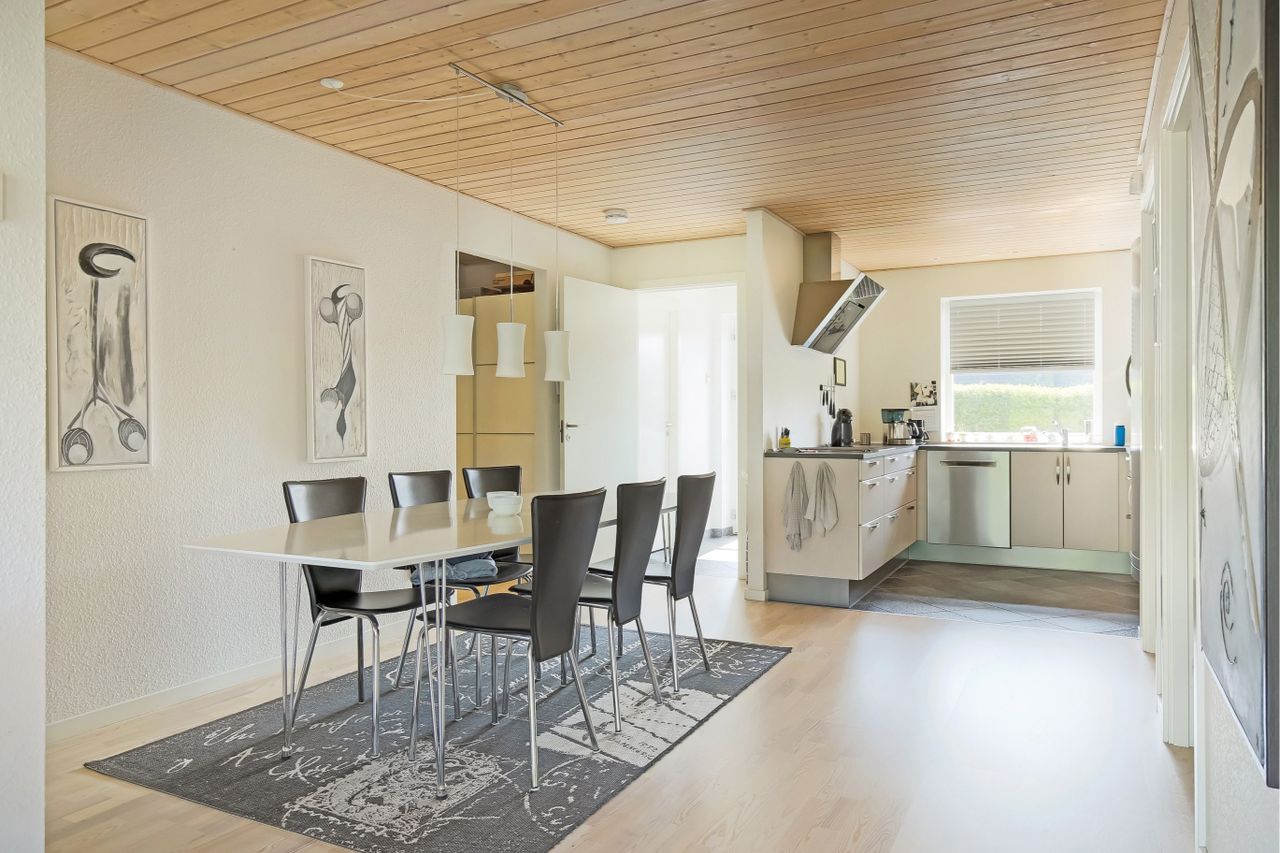 i entreen. Lækkert stort lyst køkken/alrum med god plads til spisebord og i åben forbindelse til det skønne