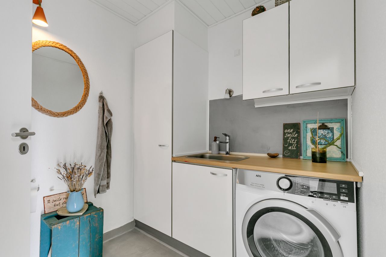 Bryggers med god skabsplads, håndvask, plads til vaskemaskine, toilet og et pænt pålagt micro cement gulv.