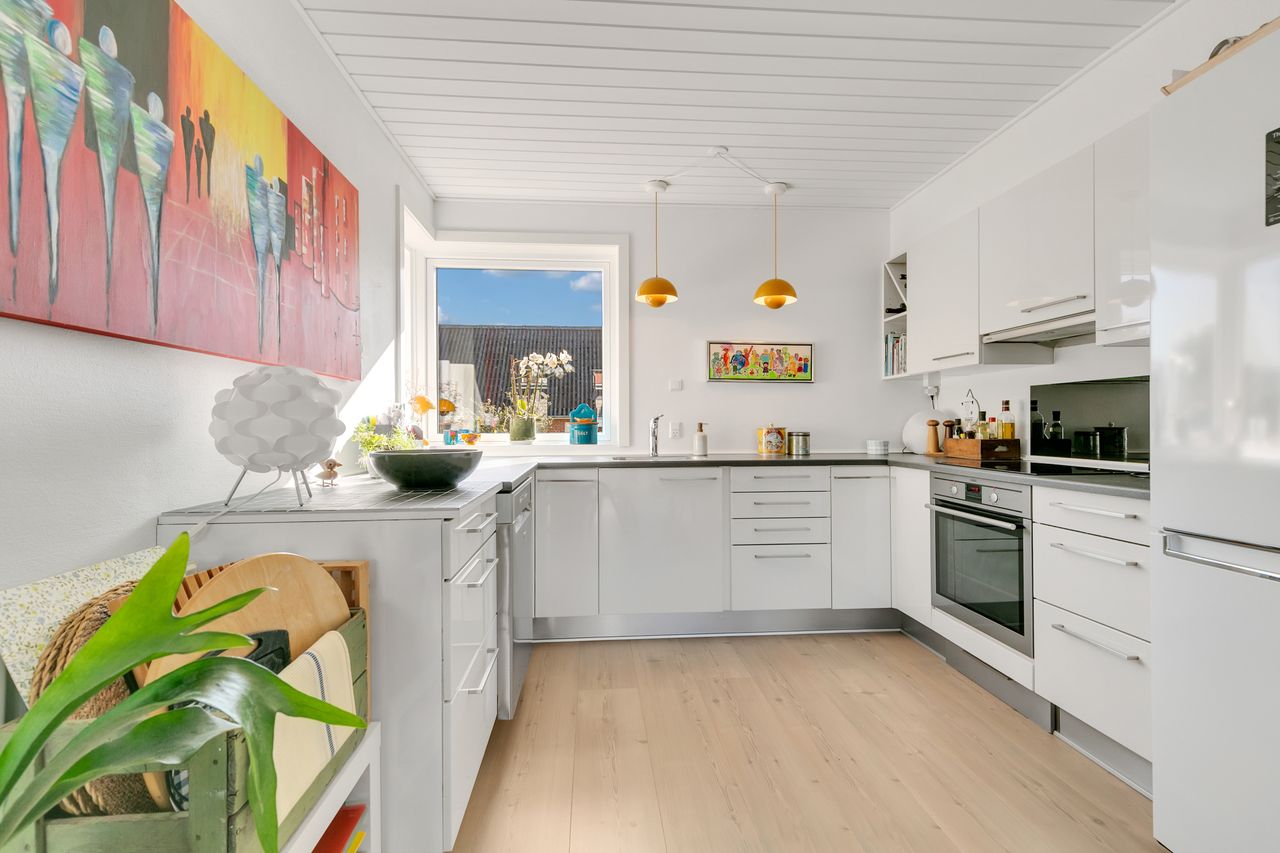 Utrolig lyst og nydeligt køkken / alrum / stue i et, med et stort lyst hvidt køkken, med mørk bordplade, plads til stort spisebord i alrummet og der er indrettet en særdeles hyggelig opholdsstue, hvor der er et fantastisk lysindfald og fra alrummet er der udgang, igennem dobbeltdør til den skønne ugenerte solrige lukkede gårdhave, med en flot træ terrasse. Hele rummet har et flot lyst laminatgulv pålagt og der er opsat et hvidt malet rustikloft.
