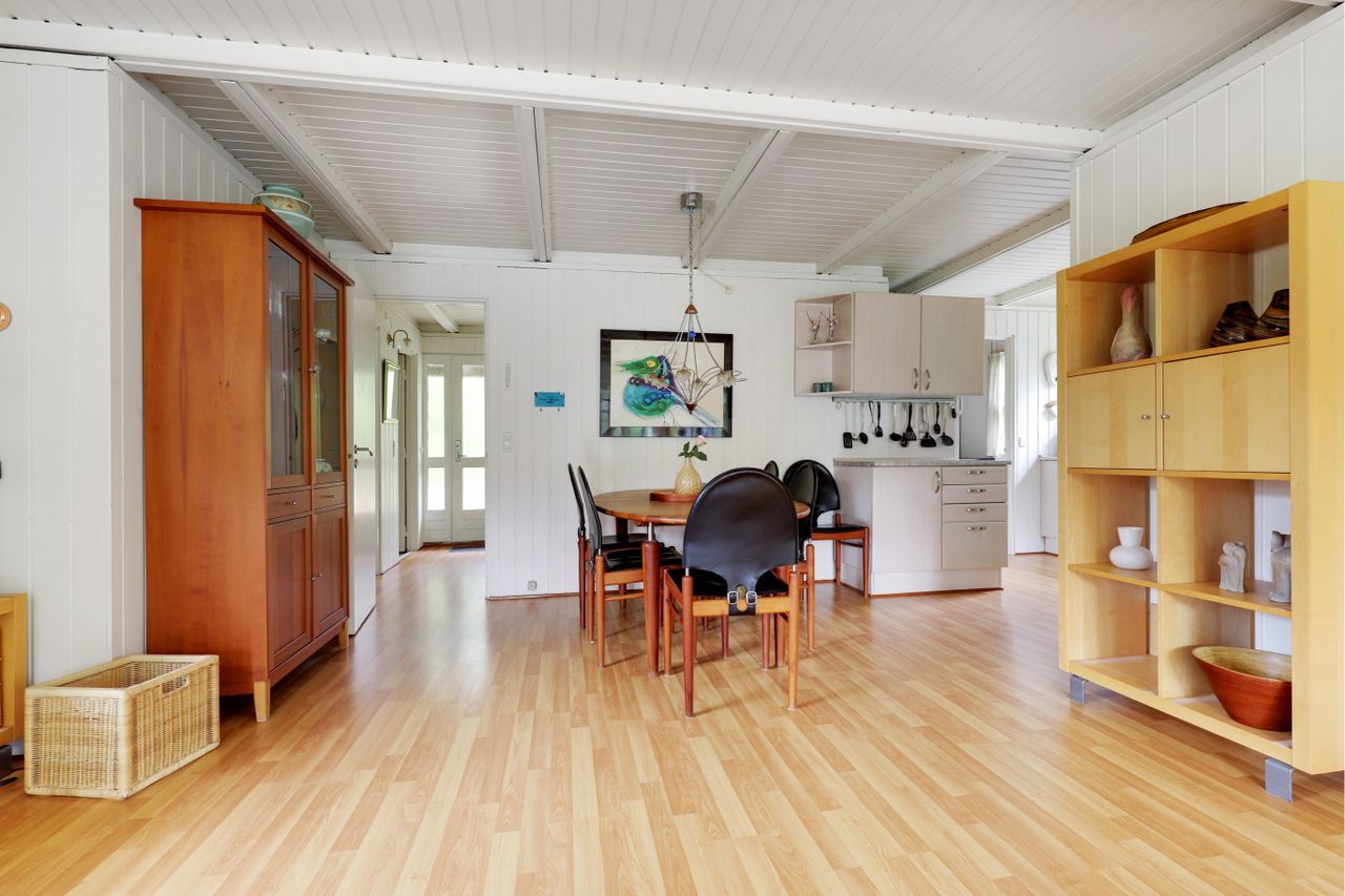 og med plads til stort spisebord samt hyggelige opholdsstue, hvor der er udgang til terrassen. Køkkenet