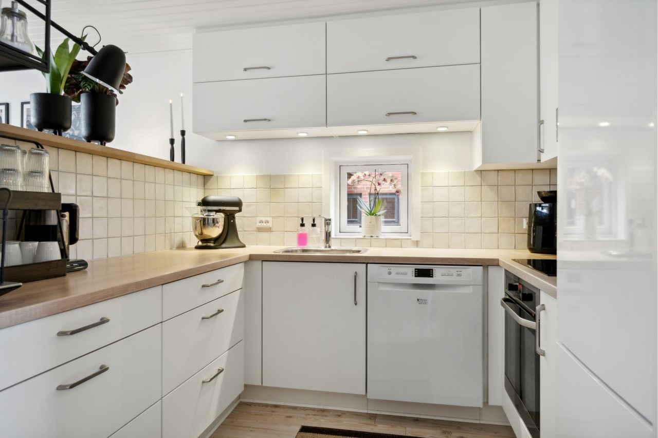 Nydeligt lyst køkken med hvide køkken elementer og flot bordplade, i åben forbindelse til stue / alrum,