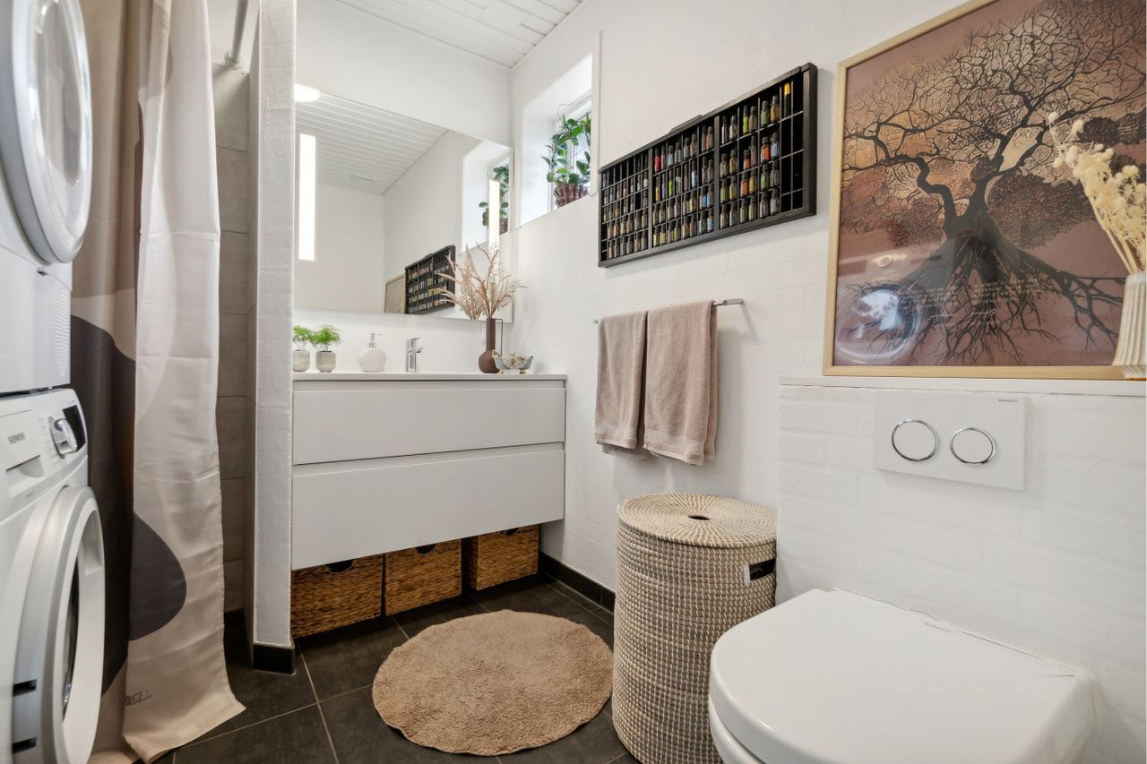 med nedfældet håndvask, ophængt toilet, sep. bruseniche, gulvvarme mv. og med plads til